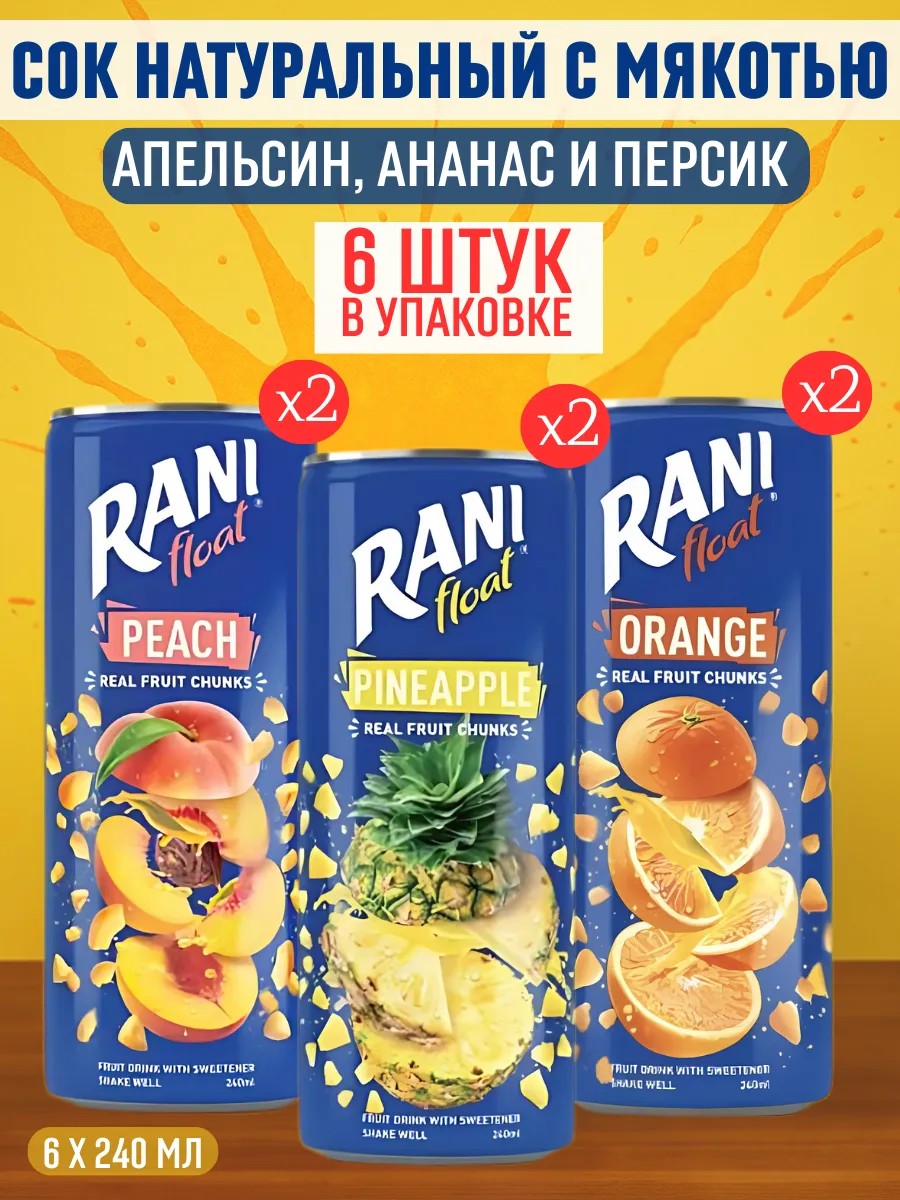 Подходит для тех, кто ищет: соки с мякотью, фруктовый микс напитков, натуральные соки без консервантов, детские фруктовые напитки, ассорти RANI 6×240 мл, упаковка микс.