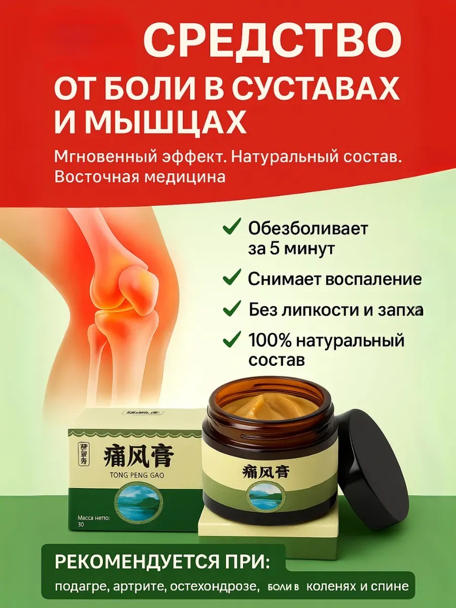 Если суставы ног иногда дают о себе знать — побаливают после долгой прогулки, отекают к вечеру или напоминают о старых диагнозах вроде артрита, подагры или вальгуса — эта китайская мазь для ног может стать настоящим помощником. Она разработана по традиционным рецептам китайской медицины и направлена на снятие боли в суставах, воспалений и усталости ног.