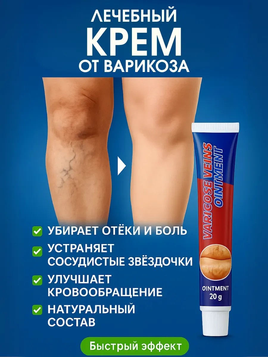 Быстрое облегчение и восстановление ваших ног! Мазь от варикоза предназначена для улучшения состояния вен при варикозном расширении, тромбофлебите и сосудистых звёздочках. Средство активно способствует нормализации кровообращения, уменьшает отёки и ощущение тяжести в ногах.