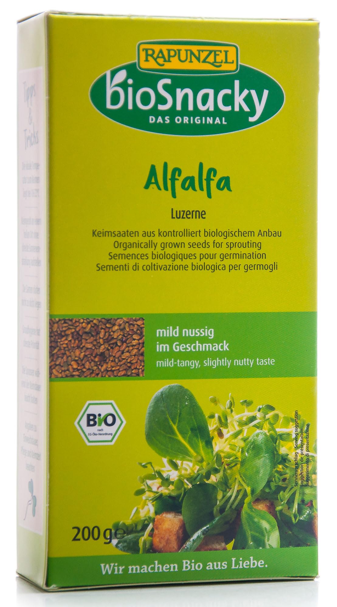 Flavor: Storage and use instructions: Store in a cool, dry place, protected from light. Preparation: Alfalfa sprouts have a particularly mild, nutty flavor and are therefore among the most popular sprouts. Ideal as a salad topping, in smoothies, summer rolls, and dips. Sprouts are the easiest way to add essential vitamins, minerals, trace elements, secondary plant compounds, and fiber to your diet any time of year—all freshly harvested and "regional" from your own windowsill. Preparation: Soak before germination. Rinse thoroughly with clean water before consumption. This will allow fibrous roots to form. Use 1 tablespoon of seeds per seed tray or germination jar. Soak for four hours. Water twice a day and harvest after 7-8 days. The ideal germination temperature is 18-22 C. Do not consume before the 7th day. Certification EU organic seal INGREDIENTS Alfalfasamen - from controlled organic productionOrganic certification: EC-Bio. Packaging quantity: (1 x 200 gr).Rapunzel Alfalfa Luzerne bioSnacky (1 x 200 gram) Smaak: Bewaren en gebruiksinstructies: Koel, droog en beschermd tegen licht bewaren. Verwerking: Alfalfa-spruiten smaken bijzonder mild nootachtig en behoren daarom tot de meest populaire soorten kiemen. Ideaal als topping voor salades, in smoothies, zomerrollen en dips. Spruiten zijn de eenvoudigste manier om op elk moment van het jaar belangrijke vitaminen, mineralen, sporenelementen, secundaire plantaardige stoffen en vezels in de voeding te brengen - en dat heel vers geoogst en 'regionaal' van de eigen vensterbank.Verwerking bereiding: weken voor het ontkiemen. Voor consumptie grondig spoelen met schoon water. vorming van vezelwortels mogelijk. Per zaadschaal of kiemglas 1 eetlepel zaden gebruiken. Vier uur weken. Twee keer per dag water geven en na 7-8 dagen oogsten. De ideale kiemtemperatuur bedraagt 18-22 C. Niet voor de 7e dag consumeren. Certificering EU biologisch zegel INGREDIËNTEN Alfalfasamen - uit gecontroleerde biologische productieBiologische certificering: EG-Bio. Verpakkingshoeveelheid: (1 x 200 gr).
