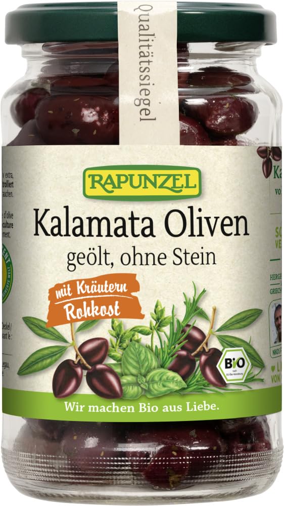 Taste: Storage and Use: Refrigerate after opening and consume promptly. Finish: Kalamata olives are distinguished by their savory, spicy flavor and multifaceted color nuances. They are lovingly cultivated by small family farms in the sunny mountainous regions of the Southern Peloponnese in Greece and hand-picked at peak ripeness. Because they are processed gently without heating, they retain the quality of premium raw foods. The olives are pitted and finished with a light marinade of the finest extra virgin olive oil and Mediterranean herbs. Serving Preparation: A classic choice for antipasti, snacks, or salads and Mediterranean dishes. EU Organic Certifications Label INGREDIENTS Olives 98.00 Olives, Sea Salt, Wine Vinegar, Extra Virgin Olive Oil, Basil, Parsley, Thyme, Oregano, Rosemary