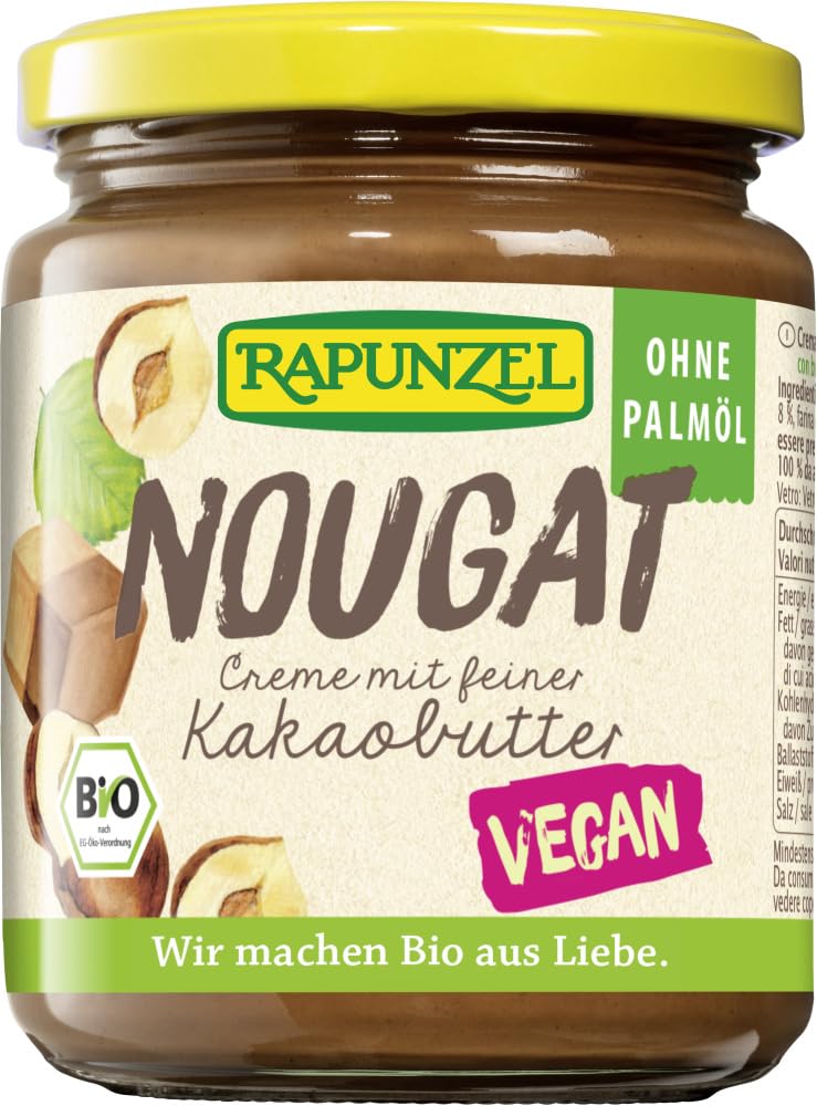 Taste: Storage and usage instructions: Please store at room temperature and avoid temperature fluctuations. Cocoa butter has a lower melting point, so do not store above 23 C. Finish: Freshly roasted hazelnuts and the finest cocoa are the secret to this spread. Thanks to the cocoa butter, it achieves a particularly delicate texture. Let yourself be seduced - Serving Preparation: as a spread, for pancakes, and on its own as a snack - European Organic Certification INGREDIENTS Hazelnuts 33.00 , cane sugar, sunflower oil, cocoa butter 8.00 , sweetened lupin flour, highly defatted cocoa powder 4.50 , bourbon vanilla INSTRUCTIONS FOR USE As a spread, for pancakes, crepes, and on its own as a snack. See moreRapunzel Crème de nougat bio au beurre de cacao (6 x 250 g)DESCRIPTION DU PRODUIT DESCRIPTION DU PRODUIT Goût : Consignes de conservation et d'utilisation : veuillez conserver à température ambiante et éviter les changements de température. Le beurre de cacao a un point de fusion plus bas, donc ne pas stocker plus de 23 C. Finition : les noisettes fraîchement torréfiées et le meilleur cacao sont le secret de cette crème. Grâce au beurre de cacao, il obtient une fusion particulièrement délicate. Laissez-vous séduire - Traitement préparation : comme pâte à tartiner, crêpes et pur pour grignoter - Certification européenne BIO INGRÉDIENTS Noix de noisette 33,00 , sucre de canne, huile de tournesol, beurre de cacao 8,00 , farine de LUPine sucrée, poudre de cacao fortement déshuilée4,50 , vanille de bourbon MODE D'EMPLOI Comme pâte à tartiner, pour les crêpes, les crêpes et pur pour grignoter. Voir plus