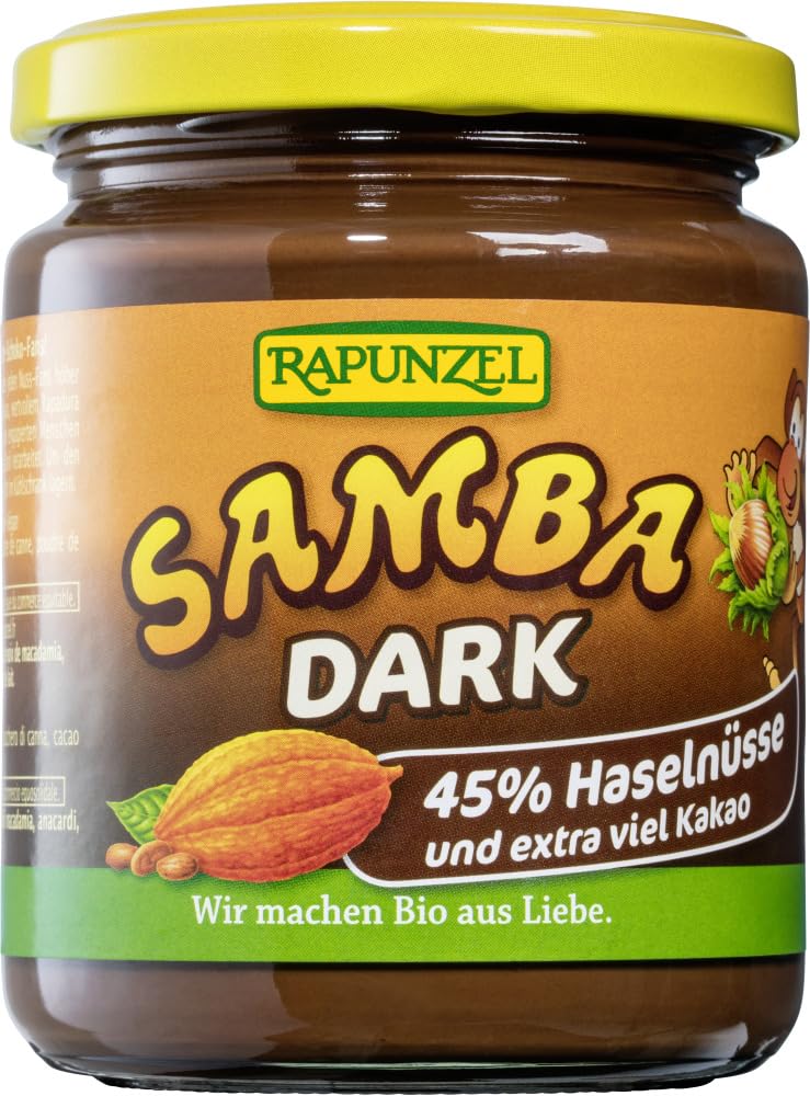 Taste: Storage and Use: Store in a cool, dry place. Production: Samba Dark – The breakfast delight for all dark chocolate lovers! 45 aromatic roasted hazelnuts will make the hearts of all nut lovers beat faster. With extra-fine aromatic cocoa, Rapadura cane sugar, and refined Bourbon vanilla, they are carefully transformed into a melt-in-your-mouth Samba Dark. The Rapadura whole cane sugar, Cristallino cane sugar, and cocoa powder are Fairtrade certified and sourced from our artisan partners. The consistency depends on the temperature. Creamy at room temperature, keep refrigerated. Processing Preparation: Use as a spread, on pancakes, crepes, and also for baking, e.g., for chocolate croissants. EU Organic Label INSTRUCTIONS FOR USE Use as a spread, on pancakes, crepes, and also for baking, e.g., for chocolate croissants.