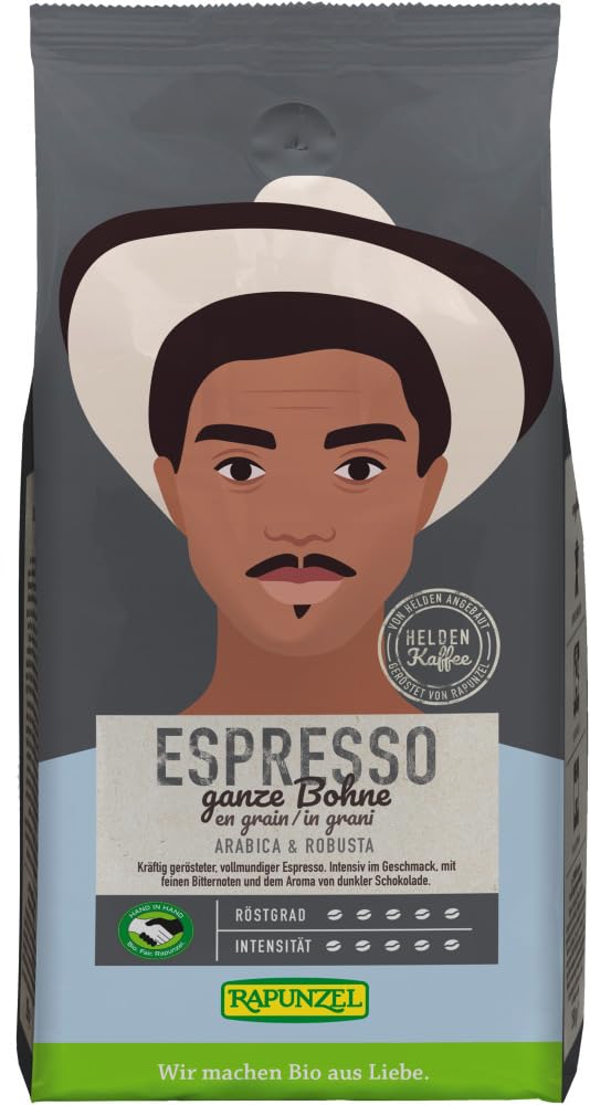 Taste: Storage and Use: Please store in a cool, dry place. Production: Hero coffee from Honduras, Peru, and Tanzania - Fairtrade by Rapunzel Hand-Partnern. Arabica Robusta. Full-bodied, strong roast espresso. Intense flavor with subtle bitter notes and the aroma of dark chocolate. Our hero coffee is called that because it comes from real heroes. Coffee growers ensure thriving biodiversity in the growing areas. Growing coffee in mixed cropping systems and under shade trees not only ensures stable, species-rich ecosystems but also the exceptional quality of the beans. Thanks to intensive care of the coffee houses, meticulous handcrafting, and special selection of coffee beans, enjoy the finest coffee, organic and 100 Fairtrade – grown by true coffee heroes. EU Organic Certifications Label INGREDIENTS Coffee Beans: Arabica, Robusta