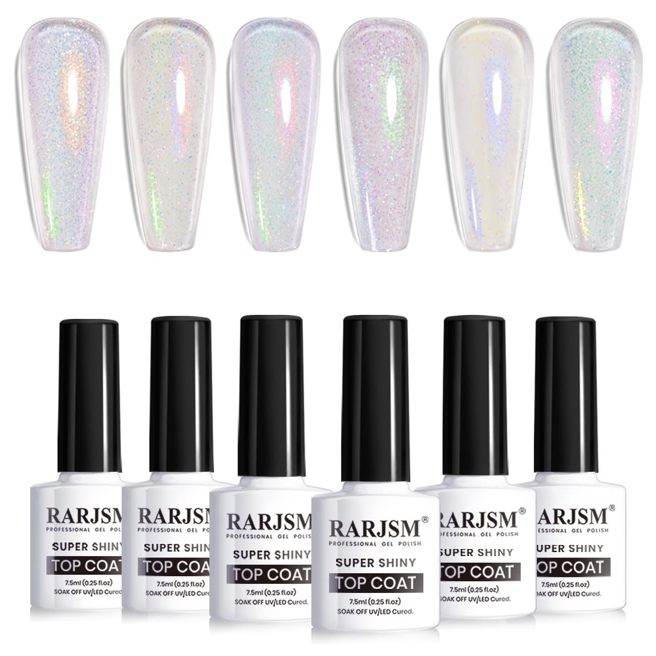 WARNING NOTES:May this top coat gel polish an allergic reaction by skin contact. Read directions for use carefully. Avoid contact with eyes, mouth, and skin. Rinse them immediately should the product comes into contact with them. If there is any incident, contact the doctor immediately. LED UV LAMP NEEDED:This clear glitter top coat gel nail polish can not be dried by air, it needs to be cured under a nail lamp. Both L E D and U V light can cure it, the recommended lighting time is 60 seconds for U V light and 90 seconds for L E D light. LONG LASTING SET:Package includes 6pcs*7.5ml RARJSM iridescent rainbow glitter no wipe glossy top coat. Long-lasting shine mirror top gel, which keeps the high gloss from 15-21 days for different people if applied correctly. DIFFERENT BASE DIFFERENT EFFECT:Fashion nail art trends can top on any base color, especially in black and dark colors, the shiny effect is more obvious. Compatible with all gel nail polish, our shell glitter top coat gel is suitable for natural nails, gel nails, artificial nails, acrylic nails, nail tips, etc. GLITTER TOP COAT GEL:A Non-Wipe Top Coat with rainbow shell glitter that gives an everlasting shine without the tacky texture. The multi-color glitter takes your manicure to the next level by changing the atmosphere of your base nail color.