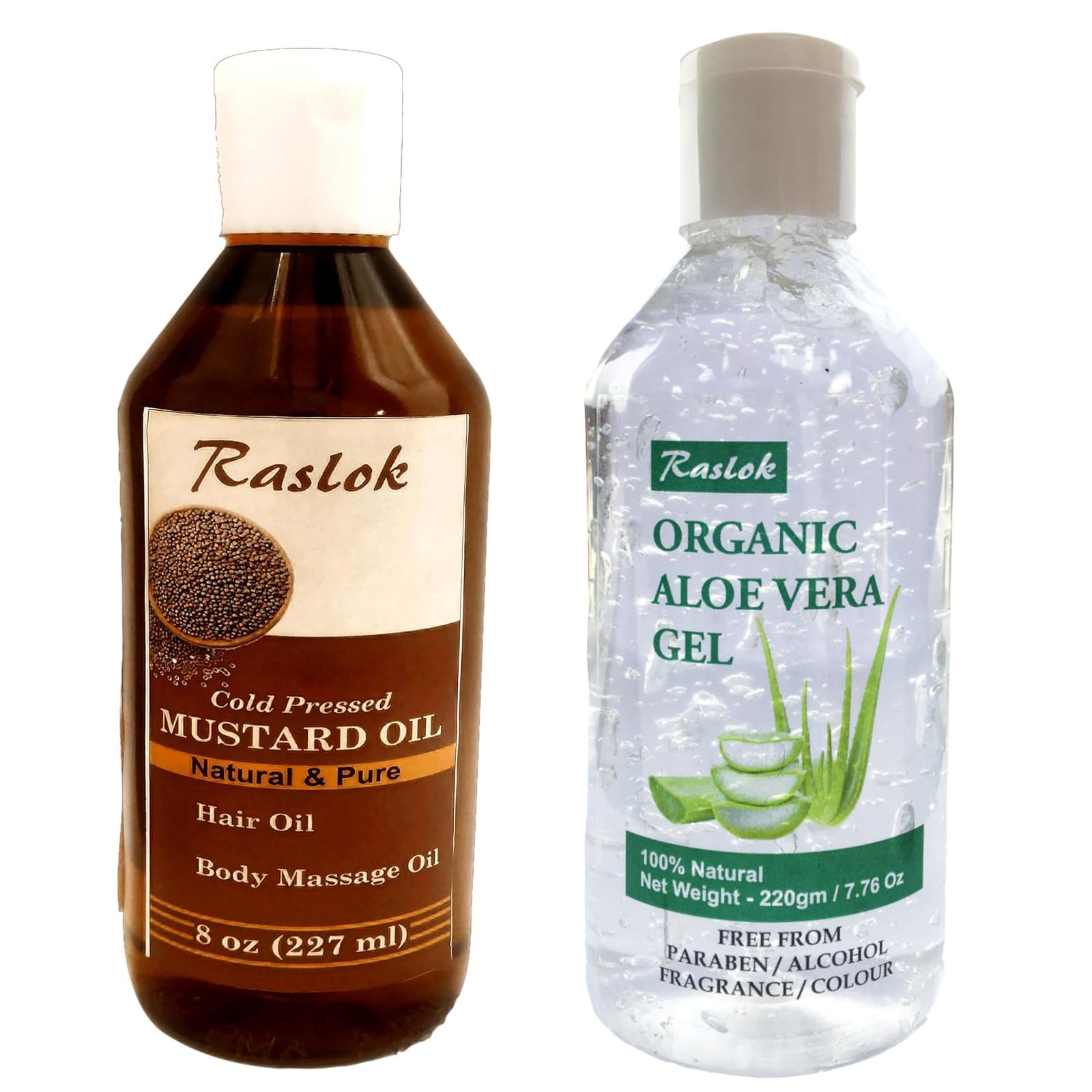 Raslok Mustard Oil 100% Pure & Natural Cold Pressed (8 Fl OZ) Aloe Vera Gel 100% Pure & Natural (7.76 OZ) Nourishing for Hair Skin & Massage Moisturizing & Hydrating Combo