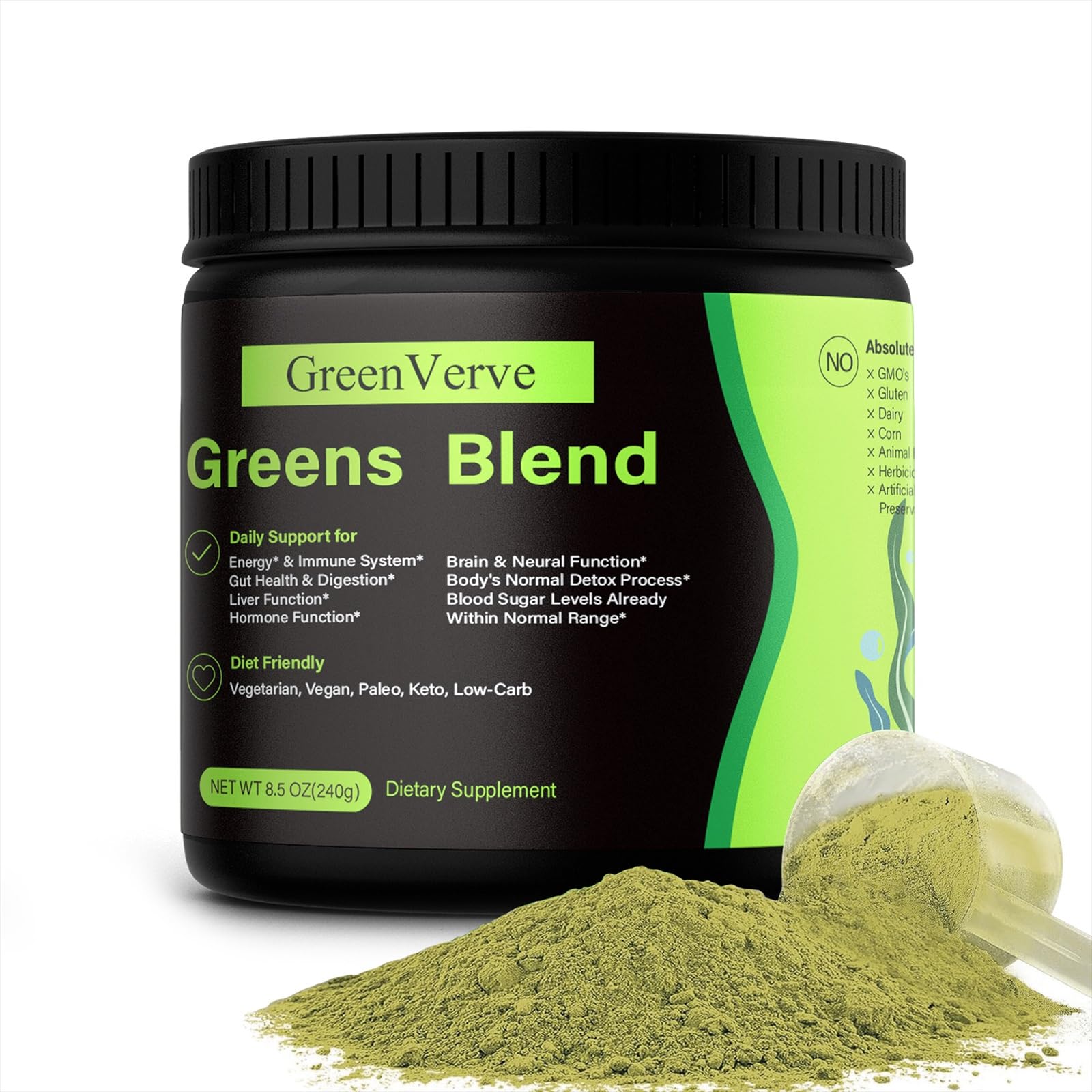 Green Superfood Blend - Plant-Based Nutrition Powder Key Benefits: 240g Total Easy to Mix: 1 scoop (8g) with water Vegan, Non-GMO No Artificial Additives or Sweeteners Resealable Packaging for Optimal Freshness Ideal for: Active Professionals Health-Conscious Consumers Various Diets (Vegan, Keto, Paleo)240g of powder for lasting well-being: Each jar contains 240g of powder, providing a generous amount to support your daily wellness routine. Thanks to its natural ingredients and multiple health benefits, it's a trusted choice for anyone who prioritizes lasting vitality. Healthy and diet-friendly formula: Made with natural flavors, it fits perfectly into a variety of diets, including vegetarian, vegan, paleo, ketogenic, and low-carb, for optimal enjoyment no matter your dietary preferences. Multi-benefit support for your body: This blend goes beyond basic nutrition: it promotes gut health and digestion. It also contributes to the maintenance of normal hemoglobin, all in one scoop. Easy-to-use daily routine: Simply take one 8g scoop daily, mix it with 240-350ml of cold water, and enjoy. For optimal nutrient absorption, drink it before breakfast on an empty stomach (or as advised by your healthcare professional). A simple way to incorporate essential nutrients into your day. Daily nutrient boost for vitality: GreenVerve Greens Blend is a delicious mix of greens, fruits, and vegetables, rich in vitamins and minerals essential for your body's well-being. It provides you with daily energy and vitality, contributing to your overall health and well-being. Ideal for anyone looking to improve their daily diet.Poudre Nutritionnelle Végétale Green Superfood - Mélange Naturel de Fruits et Légumes, Sans Sucre, Pot de 180 gDESCRIPTION DU PRODUIT Mélange de superaliments verts - Nutrition végétale en poudre Avantages clés : 240 g au total Facile à mélanger : 1 dosette (8 g) avec de l'eau Vegan, sans OGM Sans additifs ni édulcorants artificiels Emballage refermable pour une fraîcheur optimale Idéal pour : Professionnels actifs Consommateurs soucieux de leur santé Différents régimes (végan, cétogène, paléo)240 g de poudre pour un bien-être durable : Chaque pot contient 240 g de poudre, offrant une quantité généreuse pour soutenir votre routine bien-être quotidienne. Grâce à ses ingrédients naturels et ses multiples bienfaits pour la santé, c'est un choix de confiance pour tous ceux qui privilégient une vitalité durable. Formule saine et adaptée aux régimes : Composée d'arômes naturels, elle s'intègre parfaitement à divers régimes, notamment végétarien, végétalien, paléo, cétogène et pauvre en glucides, pour un plaisir optimal quelles que soient vos préférences alimentaires. Soutien multi-bénéfices pour votre corps : Ce mélange va au-delà de la nutrition de base : il favorise la santé intestinale et la digestion. Il contribue également au maintien d'une hémoglobine normale, le tout dans une seule mesurette. Routine quotidienne facile à utiliser : Prenez simplement une mesurette de 8 g par jour, mélangez-la à 240 à 350 ml d'eau froide et savourez. Pour une absorption optimale des nutriments, buvez-la avant le petit-déjeuner à jeun (ou selon les conseils de votre professionnel de santé). Un moyen simple d'intégrer des nutriments essentiels à votre journée. Boost quotidien de nutriments pour la vitalité : Le mélange de légumes verts GreenVerve est un délicieux mélange de légumes verts, de fruits et de légumes, riche en vitamines et minéraux essentiels à l'épanouissement de votre corps. Il vous apporte énergie et vitalité au quotidien, et contribue à votre bien-être. Idéal pour tous ceux qui souhaitent améliorer leur alimentation quotidienne.