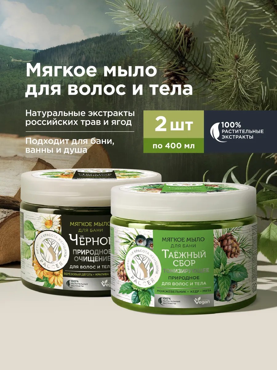 РАССЕЯ Мыло черное густое для бани и тела натуральное 2*400мл