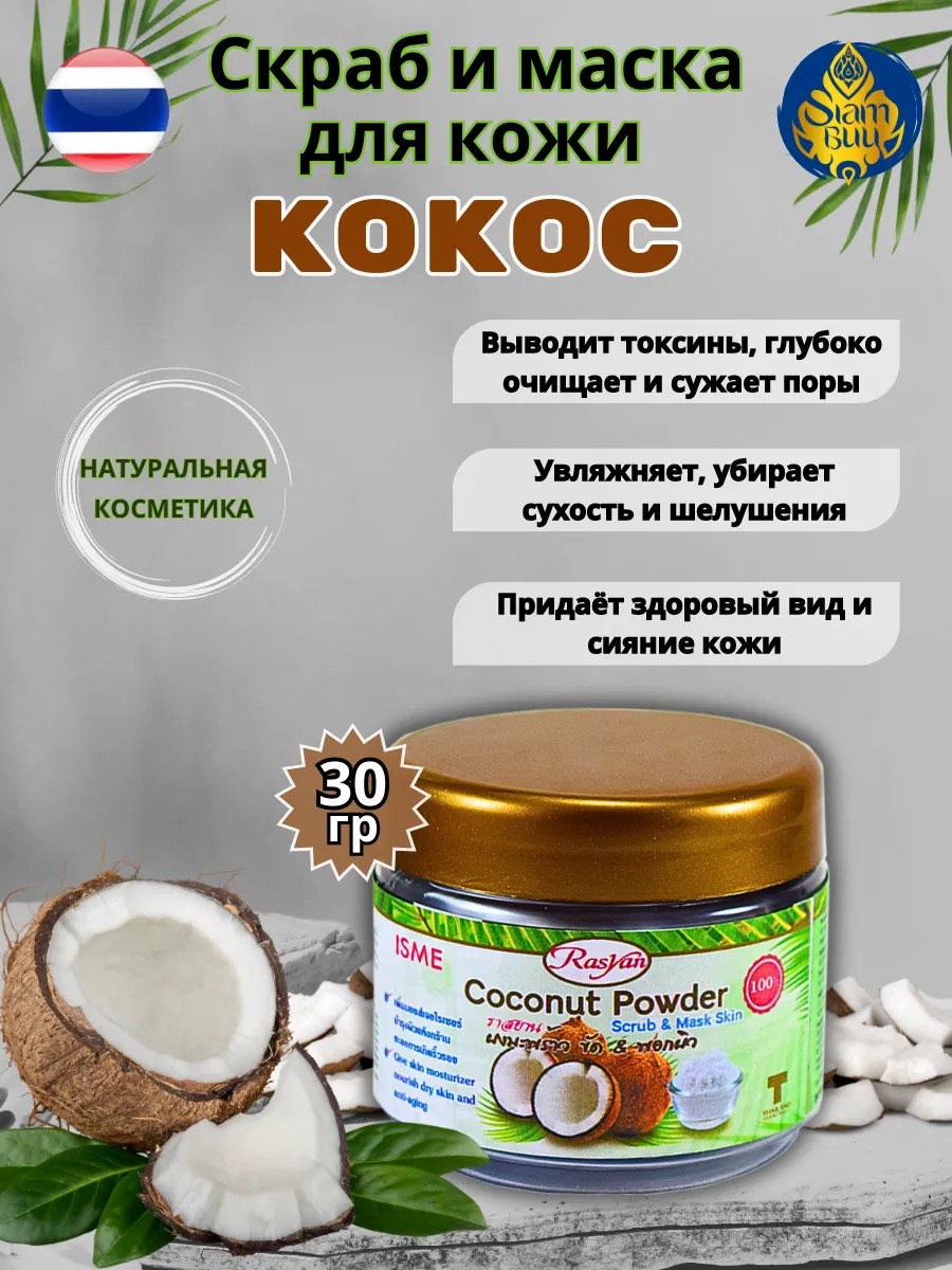 Натуральный кокосовый скраб – это прекрасная тайская уходовая косметика и эффективное средство 2 в 1 для ухода за кожей, которое выполняет сразу две важные функции – обновление и увлажнение. Косметическое средство содержит натуральное кокосовое масло, известное своими целебными и питательными природными свойствами. Оно содержит в своем составе большое количества альфа-гидроксикислот (АНА), которые прекрасно удаляют ороговевшие частички кожи, делают вашу кожу более гладкой и бархатистой. Кокосовое масло способствует увлажнению и смягчению кожи, восстановлению водного баланса в эпидермисе.