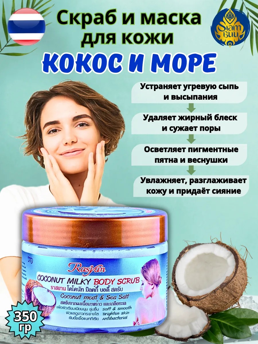 Coconut Milky Scrub – effective professional skin care for the face, body, feet, and hands with milk proteins from the Thai brand Rasyan. This cleansing and rejuvenating scrub is suitable for problematic, oily or dry skin, for men, women, and teenagers, and contains a complex of active ingredients: 1) Natural abrasive from coconut shell powder – gently removes dead skin cells, renews the outer layer of skin, and imparts smoothness and radiance.