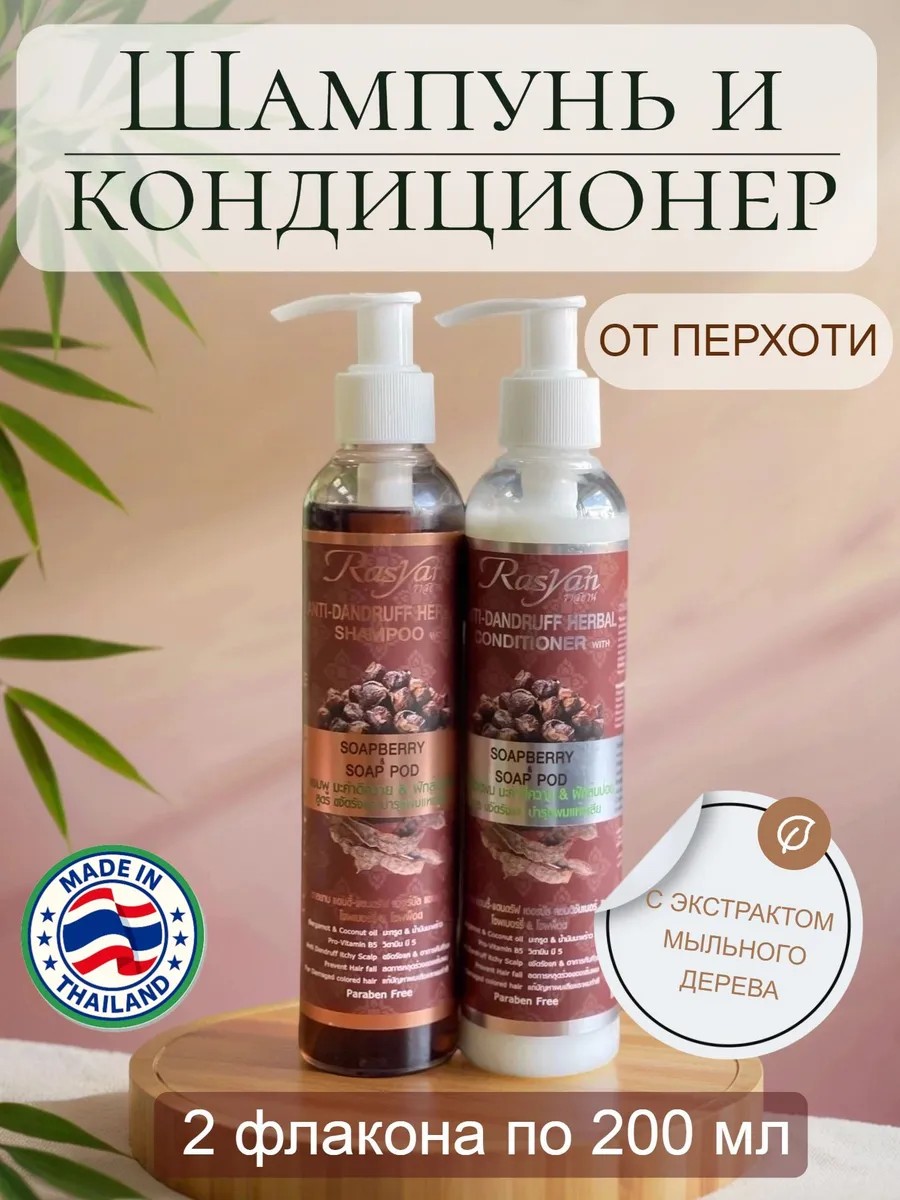 Набор для ухода за волосами Rasyan: тайский шампунь и кондиционер с мыльным деревом и бергамотом — это комплексное решение против перхоти, зуда и излишней жирности кожи головы. Средства обладают антибактериальными и противогрибковыми свойствами, укрепляют волосы, восстанавливают повреждённые и окрашенные пряди, уменьшают выпадение и придают волосам естественный блеск.