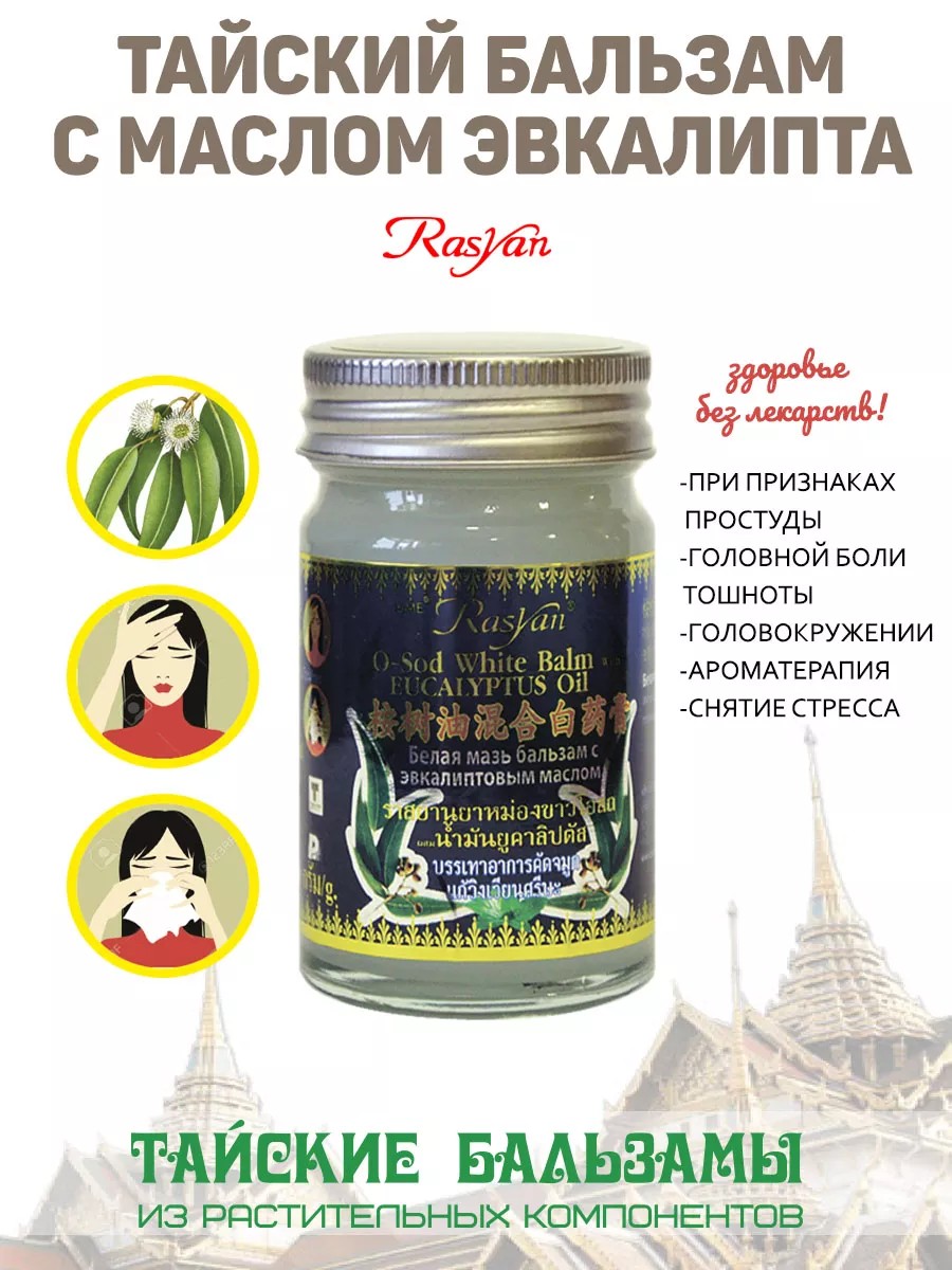 Тайский белый бальзам с эвкалиптовым маслом Rasyan используется для облегчения простуды, заложенности носа и расслабления от стресса. Бальзам показан в качестве обезболивающего средства при мышечных болях, воспалительных заболеваниях суставов, переломах, растяжениях и ушибах.