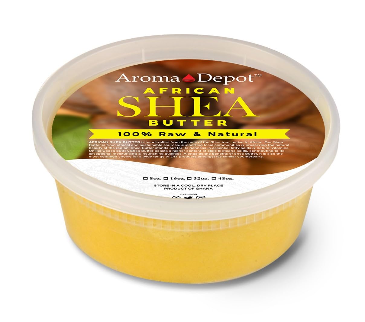 MULTI-PURPOSE: Our Shea Butter can be used for a variety of purposes, including as a moisturizer for the face and body, a natural lip balm, a hair conditioner, and more. SOFTENS AND SMOOTHS SKIN: The high content of natural fats in Shea Butter helps to soften and smooth the skin, making it an excellent choice for skincare products, especially for those with sensitive or dry skin. NOURISHING MOISTURIZING: Our Shea Butter is rich in essential fatty acids, including oleic, stearic, linoleic, and palmitic acids, as well as natural vitamins A, E, F. These nutrients help to moisturize and nourish the skin, making it ideal for dry, chapped, or irritated skin. ETHICAL SUSTAINABLE: We source our Shea Butter from ethical and sustainable suppliers who are committed to supporting local communities and preserving the natural beauty of the region. 100 VEGAN FRIENDLY: Our Shea Butter is suitable for Vegans Vegetarians as it does not contain any animal-derived ingredients and is not tested on animals. External use only. 100 Unrefined, maintaining its pure form with a distinct oily, nutty, and smoky scent. Note that it may not be odorless. Small impurities and sediment, like plant fiber, are normal in unrefined Shea Butter. Embrace the natural essence and qualities of Aroma Depot Shea Butter for your skincare needs. SOLD BY VOLUME.
