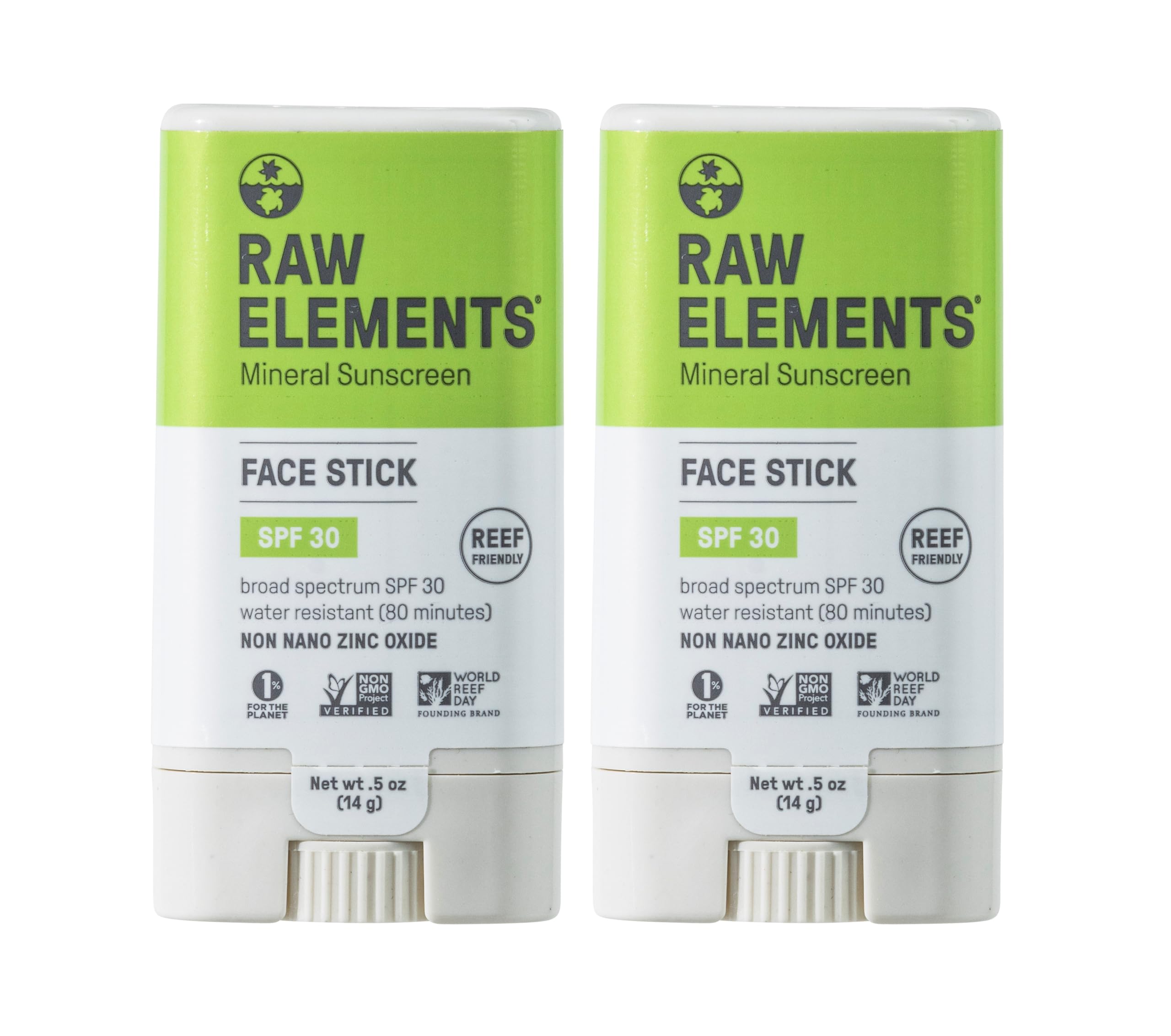 Raw Elements Face All-Natural Mineral Sunscreen Stick Non-Nano Zinc Oxide 95% Organic Water-Resistant 80 Min Reef Safe All Ages Safe SPF 30+ Travel Sunblock 0.5 oz 2PK