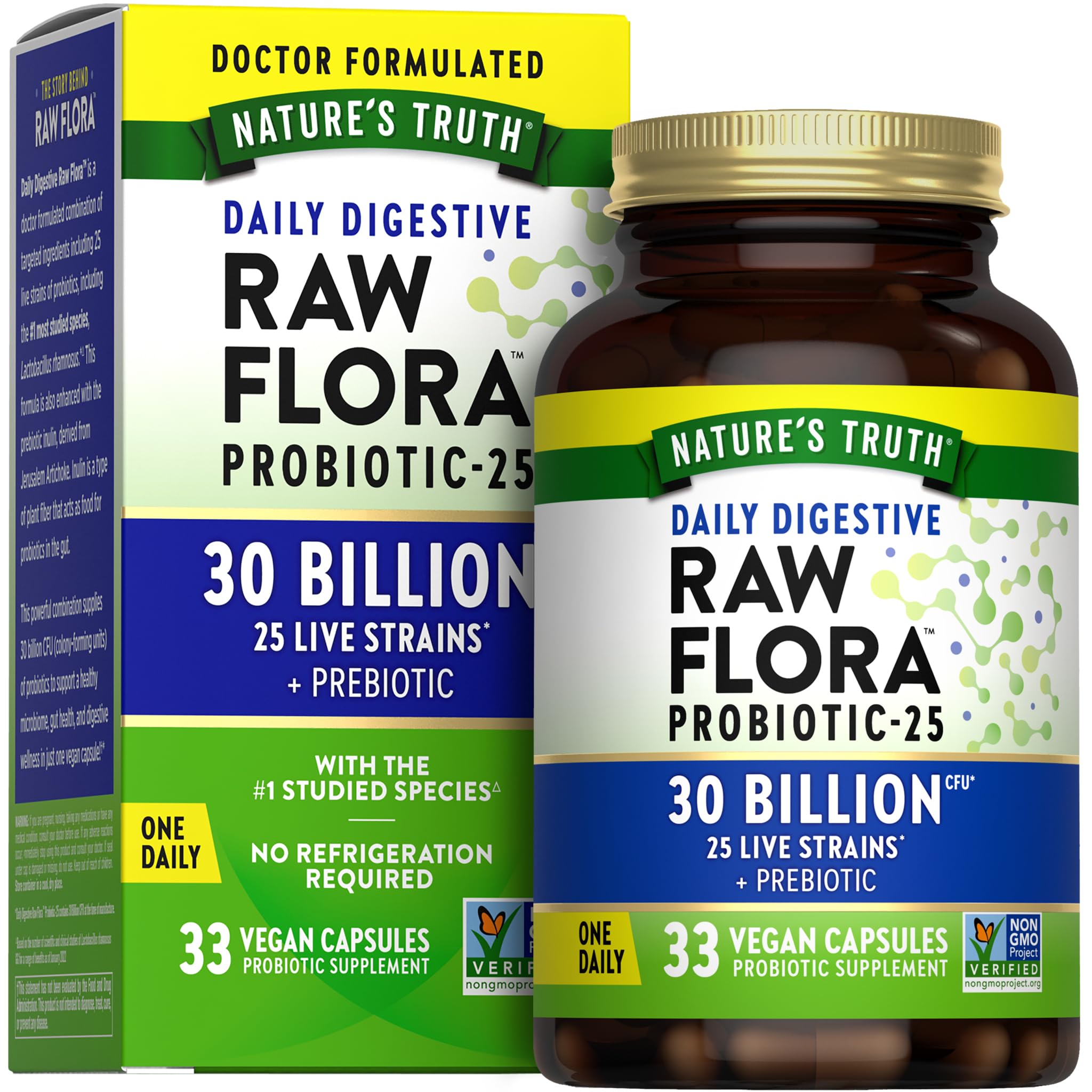 QUALITY TESTED: Raw Flora probiotics are manufactured, packaged, and verified in the United States, following the FDA's current Good Manufacturing Practices (cGMP). NO REFRIGERATION REQUIRED: Vegan, Non-GMO Project Verified, and free of Gluten, Wheat, Yeast, Milk, Lactose, Soy, Artificial Color, Artificial Flavor, Artificial Sweetener Preservatives. SUSTAINABLE BOTTLE: Dark amber glass bottle is 100 recyclable, and protects the probiotics inside from moisture light. POWERFUL SUPPORT: One vegan capsule daily delivers 30 billion CFU from 25 live probiotic strains . DAILY PROBIOTIC FOR MEN WOMEN: Premium probiotic support for adults, with prebiotic support from inulin.