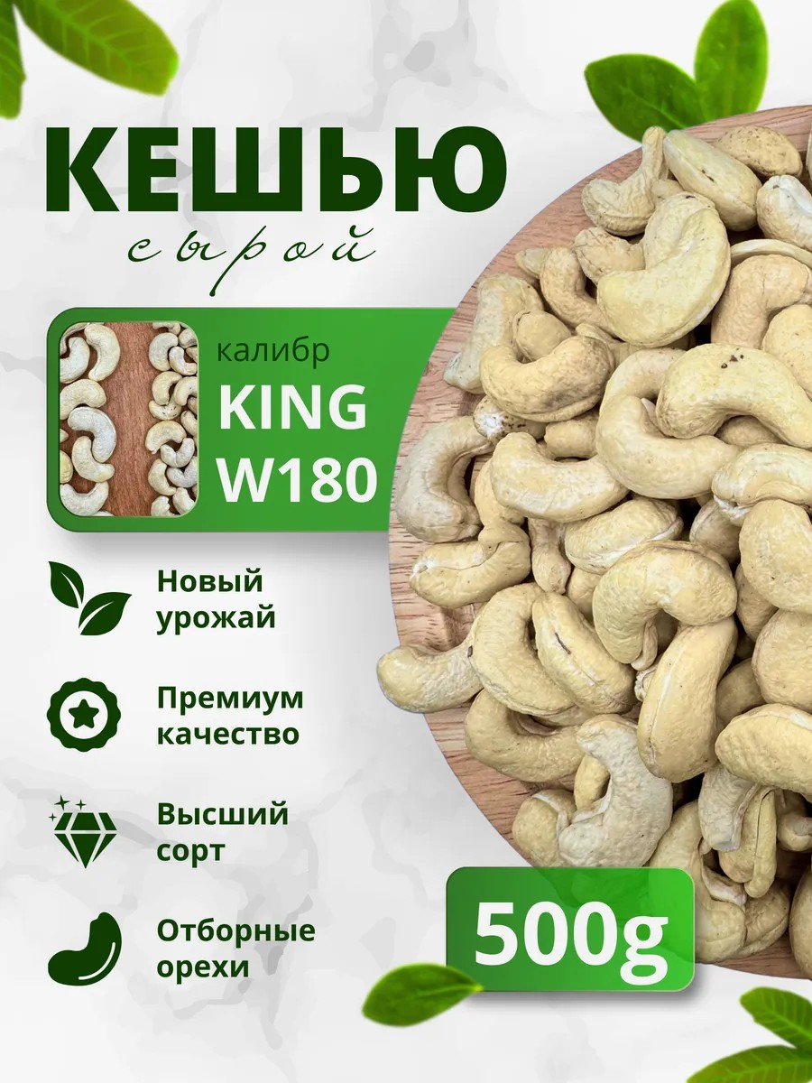 Калибр W180 KING кешью - король кешью. Это самые крупные орехи! Большие по размеру орехи высокого качества и непревзойденного вкуса станут отличным перекусом для всех, кто заботится о своем здоровье.