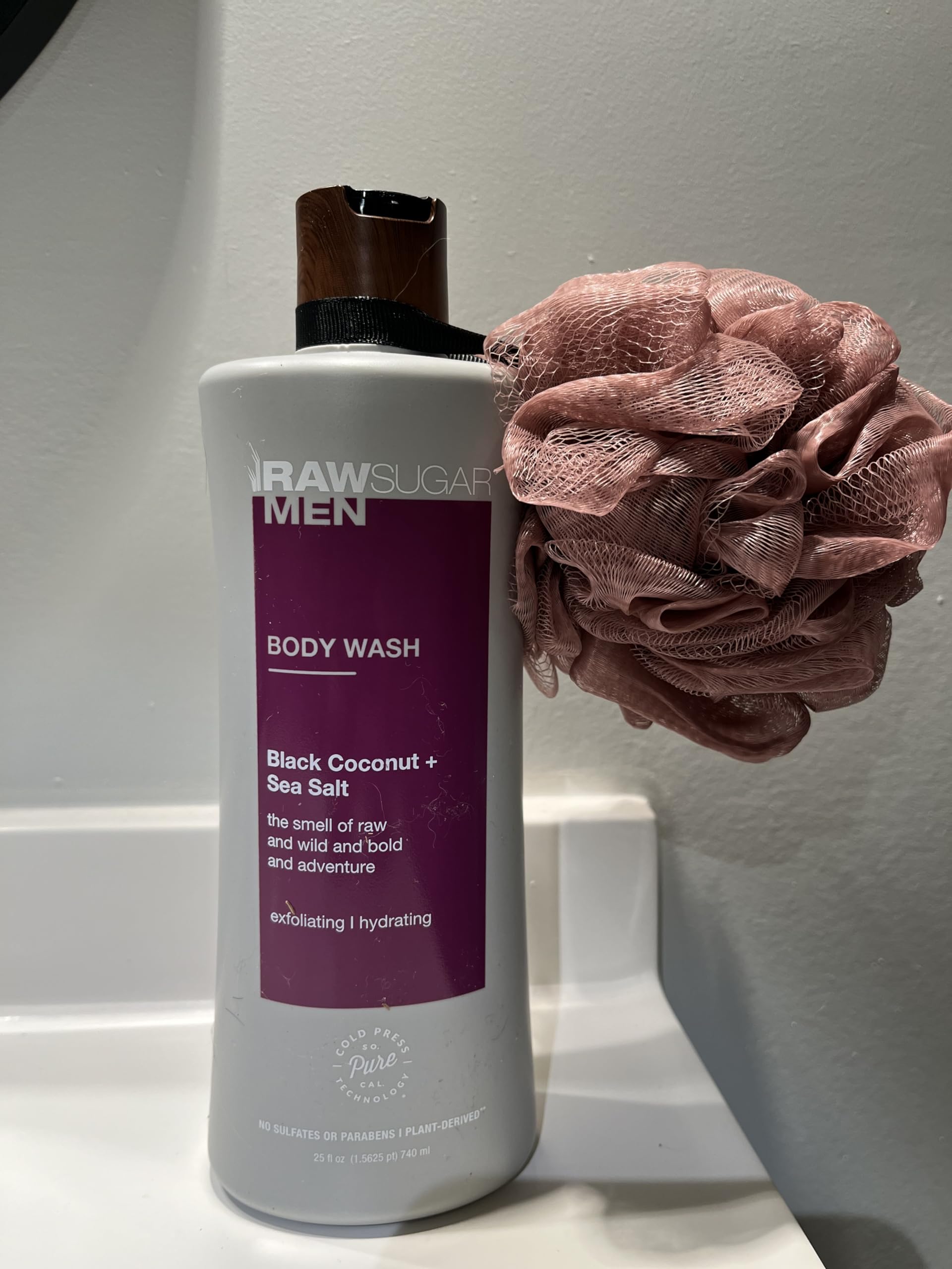 Raw Sugar Men's Body Wash Black Coconut + Sea Salt with sponge loofah. RAW MEN SMELL GOOD Made with Plant-Derived Ingredients & Cold Pressed Extracts