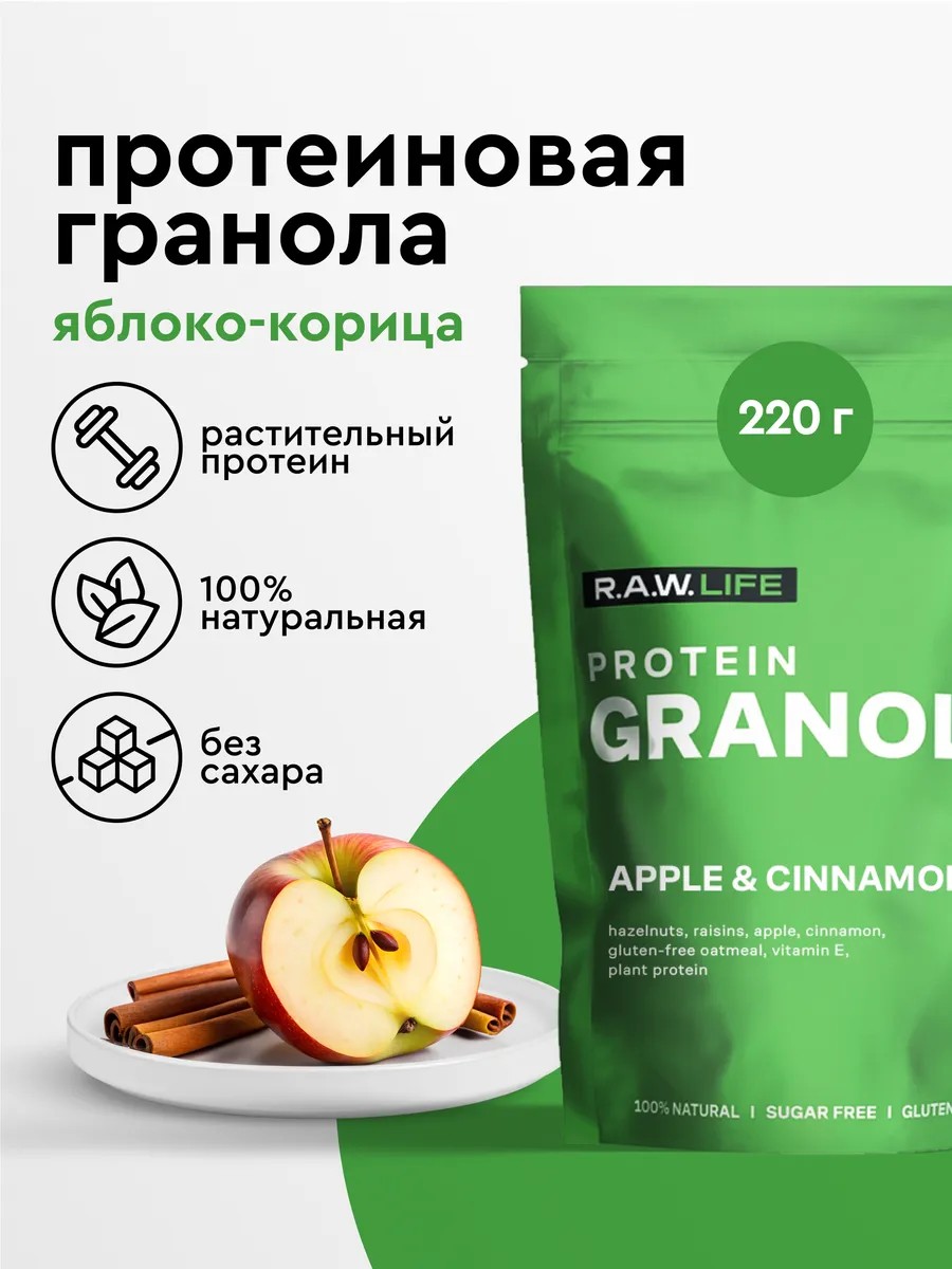 Наша гранола R.A.W. LIFE PROTEIN APPLE-CINNAMON - это волшебное сочетание, которое наполняет ваш завтрак уютом и теплом. Каждый кусочек этой гранолы словно обнимает вас в хмурое утро, вызывая приятные воспоминания о домашних пирогах с яблоками. Приготовленная с заботой, гранола станет не только вкусным, но и питательным завтраком, зарядив вас энергией на целый день.