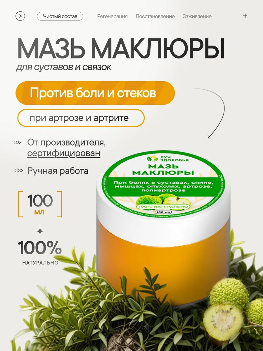 Натуральная мазь для суставов и связок Маклюра, это чудо мазь для снятия боли в спине, больных суставов, против отеков, вызванных воспалительными процессами, тянущей и ноющей ломоте в мышцах.