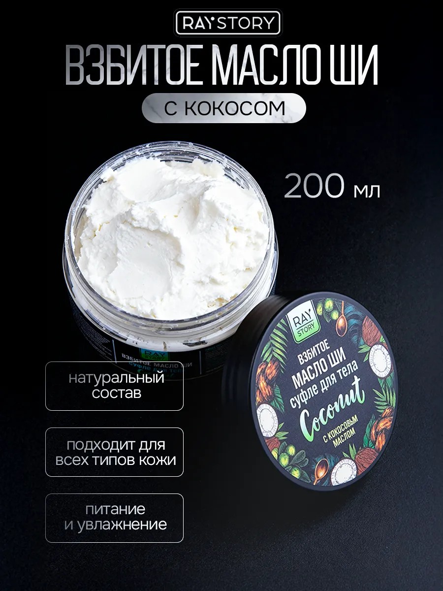 Обычное кокосовое масло быстро становится жидким в теплых условиях, а твердые масла для тела сложно распределить по коже. Баттер-крем для тела от Ray Story - это нежное суфле для тела с воздушной текстурой, которую легко и приятно наносить. Масло ши нерафинированное известно стойким неприятным запахом и быстро окисляется после вскрытия. Поэтому наш крем баттер состоит только из натуральных рафинированных масел, парфюмирован нежной кокосово-шоколадной арома-композицией и долго сохраняет полезные свойства после вскрытия.