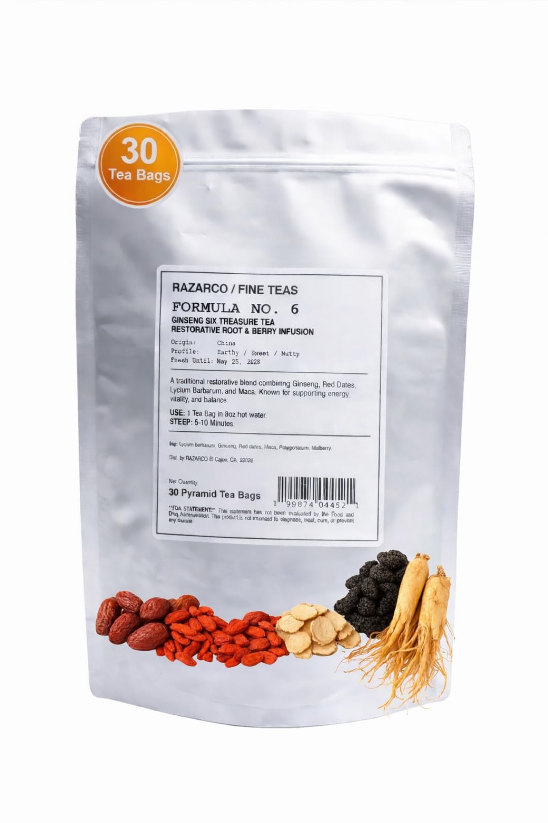 RAZARCO Formula No. 6 Ginseng Six Treasures Tea | 30 Pyramid Tea Bags | Panax Ginseng Maca Root Red Dates & Goji | Caffeine-Free Herbal Vitality Tea | 30-Day Supply