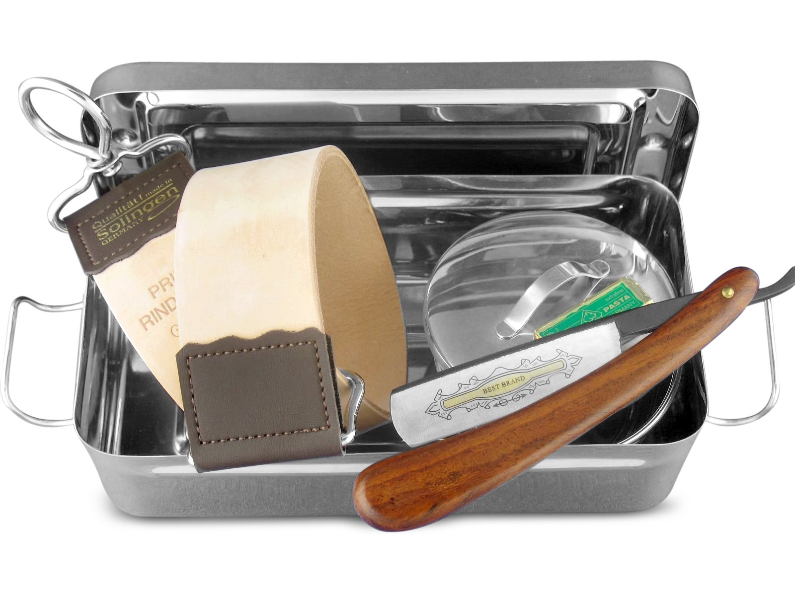 5-part razor set with string string paste and pull-off leather from Solingen shaving trap including gift box The professional shave set for daily wet shaving consists of the following razor utensils: 1 x razor with hollow cut - classic wooden grip variant.The blade has a noble golden estate and a black blade back, which makes the razor an optical highlight.The hollow cut and the blade width of 5 8 inches (blade length 7.0 cm, blade width approx. 2 cm) are ideal for beginners.Normal steel-rasier knife blade, simply recharge 1 x battle string string from Solingen - Made in Germany - Total length including eyelet 49 cm, work surface length 33 cm, width 4.5 cm.Usable on the 2 side, one side is fine and roughened, for cleaning and the sharpening process 1 x classic shaving soap shell with lid made of stainless stainless steel - ideal for foaming, as well as for storing shaving soap.Diameter approx. 8 cm, height approx. 4 cm.No more drying out of the soap 1 x extra -fine grinding paste from Puma from Solingen to maintain the string strap and to support the sharpening process - made in Germany 1 x razor box made of stainless steel - perfect box for storing and transporting razor, razor, pastes, string straps, shaving brushes, beard shears and much more.With ironing clasp.Outside approx. 20 cm x 10 cm x 7 cm (BXTXH) without bracket measuredpremium quality - our razors and the accessories are manufactured and processed by specially trained specialists.Grinding paste - brand quality from Puma from Solingen - Fine grinding paste to support the sharpening process and maintain the leather string.Complete set - for daily professional wet shave at home, ideal, e.g. as a Christmas present.Razor-Simply absensing normal steel razor blade with noble gold ostrich and hollow cut and black blade back.Professional razor -set - razor with gold etching - shaving soap shell brands sanding paste and pull -off leather from Solingen in a noble storage box 5 -part.5-Teiliges Rasiermesser-Set mit Streichriemenpaste und Abziehleder aus Solingen Rasier-Tiegel inklusive Geschenkbox Das professionelle Rasur Set zur täglichen Nassrasur besteht aus folgenden Rasierutensilien: 1 x Rasiermesser mit Hohlschliff - Klassische Griffvariante aus Holz. Die Klinge besitzt eine edle Goldätzung und einen schwarzen Klingenrücken, das macht das Rasiermesser zu einem optischen Highlight. Der Hohlschliff und die Klingenbreite von 5 8 Zoll ( Klingenlänge 7,0 cm, Klingenbreite ca. 2 cm) sind bestens geeignet für Einsteiger. Normalstahl-Rasiermesser-Klinge, einfach nachzuschärfen 1 x Rindleder Streichriemen aus Solingen - made in Germany - Gesamtlänge inkl. Ösen 49 cm, Arbeitsflächen-Länge 33 cm, Breite 4,5 cm. 2-Seitig verwendbar, eine Seite ist fein und eine Seite aufgeraut, für die Reinigung und den Schärfvorgang 1 x klassische Rasierseifen-Schale mit Deckel aus rostfreiem Edelstahl - optimal geeignet zum Aufschäumen, sowie zur Aufbewahrung der Rasierseife. Durchmesser ca. 8 cm, Höhe ca. 4 cm. Kein Austrocknen mehr der Seife 1 x Extrafeine Schleifpaste von Puma aus Solingen zur Pflege des Streichriemen und zur Unterstützung des Schärf-Vorganges - Made in Germany 1 x Rasiermesser Box aus rostfreiem Edelstahl - Perfekt passende Box zur Aufbewahrung und Transport von Rasiermesser, Rasiertiegel, Pasten, Streichriemen, Rasierpinsel, Bartschere und vielem mehr. Mit Bügelverschluss. Außemaße ca. 20 cm x 10 cm x 7 cm (BxTxH) ohne Bügel gemessenPREMIUM QUALITÄT - Unsere Rasiermesser und das Zubehör werden von speziell ausgebildeten Fachkräften hergestellt und verarbeitet. SCHLEIFPASTE - Markenqualität von Puma aus Solingen - Feine Schleifpaste zur Unterstützung des Schärf-Vorganges und Pflege des Leder Streichriemens. KOMPLETT-SET - Für die tägliche professionelle Nass Rasur zuhause, ideal z.B als Weihnachtsgeschenk. RASIERMESSER - Einfach nachzuschärfende Normal-Stahl Rasiermesser-Klinge mit edler Goldätzung und Hohlschliff und schwarzem Klingenrücken. PROFI Rasiermesser-Set - Rasiermesser mit Goldätzung - Rasierseifenschale Marken Schleifpaste und Abziehleder aus Solingen in edler Aufbewahrungsbox 5-Teilig.Rasiermesser Geschenk Set - Rasiermesser 5 8 Zoll mit Goldätzung Abziehleder und Schleifpaste aus Solingen Rasierschaum Schale Aufbewahrungs-Box 5-Teilig