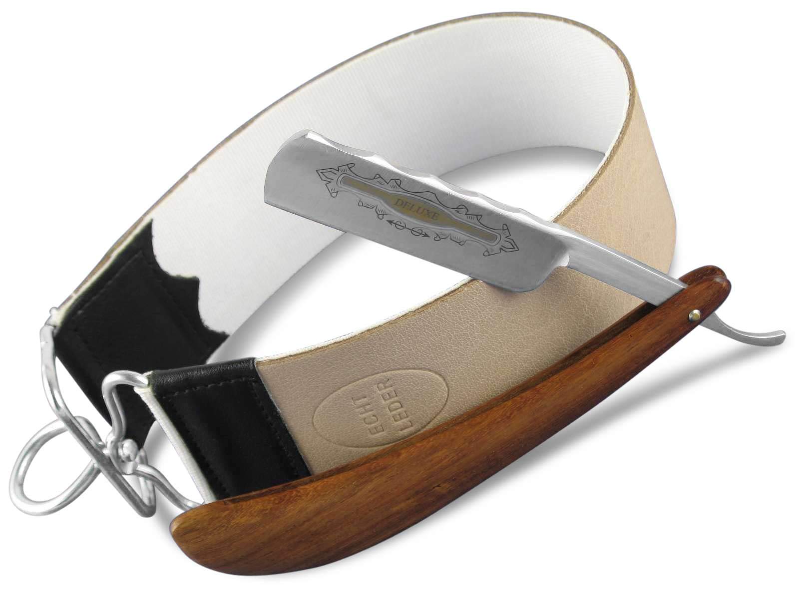 2-part razor set For men consisting of a razor and a string strap.The pull -out leather was made by real leather by hand.This razor set is particularly suitable for beginners, beginners, beginners.A great razor set for classic shaving.A popular set as a gift for men, for example as a Christmas present, birthday present and Easter gift. No further costs, in contrast to interchangeable blades (razor blades must always be bought for expensive money), no further costs for razor blades in our cases.You can also achieve a thorough shave with our shaving knives. Professional combination string string leather made of cowhide.Leather / linen.Length: 45 cm.Width 5 cm.2 side: cowhide / linen.The leather side is for sharpening and the linen side for cleaning / polishing the razor blade. Razor with golden estate and brown real wood handle (booklet).Ergonomic handles.Very high quality.Hollow.Ideally suited for beginners.Blade height: approx. 2.1 cm (5/8 inches). Made (blade) made of razor steel. The use of our real leather string string ensures incredible results when sharpening razors.It is not for nothing that it is traditionally used to re -sharpen razor meters.Specialist trade quality of instrument rw based in Germany. GENERAL INFORMATION Shaving, wet shaving, shave, hand rasur, classic shave professional combination string string as a tangled pull leather off straps made of fine cowhide.Leather / linen premium quality.Real leather.Professional quality.Total length: 45 cm.Width 5 cm.2 sides: one side made of real cowhide and one made of linen.The leather side is for sharpening and the linen side for cleaning and polishing the razor blade.Optimal grinding property.Very smooth.With your new handmade razor you can improve yourself and your beard easily and precisely.You will notice your counterpart even more positively.Only when contours of your beard are trimmed clean, then it looks well -groomed and aesthetic.Gift idea.A great razor set for classic shaving.A popular set as a gift for men, for example as a Christmas present, birthday present and Easter gift.The use of our real leather string string ensures incredible results when sharpening razors.It is not for nothing that it is traditionally used to re -sharpen razor meters.Razor with golden estate and brown real wood handle (booklet).Noble handle (booklet) variant made of wood.The back of the blade is extensively processed with hollows, a real highlight.The handle switches are ergonomically shaped.Very high quality.Easy to clean.The blade is hollow.Ideally suited for beginners.Blade length: 7.0 cm, blade height: approx. 2.1 cm (5/8 inches).Real manual work.Made (blade) made of razor steel. 2-Teiliges Rasiermesser-Set für Herren bestehend aus einem Rasiermesser und einem Streichriemen. Das Abziehleder wurde aus echtem Leder in Handarbeit hergestellt. Dieses Rasier Set ist besonders für Einsteiger, Anfänger, Beginner geeignet. Ein tolles Rasiermesser Set für die klassische Rasur. Ein beliebtes Set als Geschenk für Herren z.B. als Weihnachtsgeschenk, Geburtstagsgeschenk und Ostergeschenk. KEINE WEITEREN KOSTEN im Gegensatz zu Wechselklingenrasiermesser (Rasierklingen müssen da immer für teures Geld nachgekauft werden), bei unseren fallen keine weiteren Kosten für Rasierklingen an. Außerdem können Sie mit unseren Rasiermessern eine gründlicher Rasur erzielen. Profi Kombi Streichriemen Abziehleder aus Rindleder. Leder / Leinen. Länge: 45 cm. Breite 5 cm. 2 Seitig: Rindleder / Leinen. Die Lederseite ist zum Schärfen und die Leinen Seite zum Reinigen / polieren der Rasierklinge. Rasiermesser mit Goldätzung und braunem Echt Holz Griff (Heft). Ergonomische Griffe. Sehr Hochwertig. Hohl geschliffen. Bestens geeignet für Anfänger. Klingenhöhe: ca. 2,1 cm (5/8 Zoll).Gefertigt (Klinge) aus Rasiermesserstahl. Die Nutzung unseres Echt Leder Streichriemens sorgt für unglaubliche Ergebnisse beim Schärfen von Rasiermesser. Nicht umsonst wird er traditionell zum Nachschärfen von Rasiermessern verwendet. Fachhandel Qualität von InstrumenteNRW mit Sitz in Deutschland. ALLGEMEINE ANGABEN Rasieren, Nassrasur, Rasur, Handrasur, Klassische RasurProfi Kombi Streichriemen als Hängeriemen Abziehleder Abziehriemen aus feinem Rindleder. Leder / Leinen Premium Qualität. Echtes Leder. Profi-Qualität. Gesamtänge: 45 cm. Breite 5 cm. 2 Seitig: Eine Seite aus echtem Rindleder und eine aus Leinen. Die Lederseite ist zum schärfen und die Leinen Seite zum reinigen und polieren der Rasierklinge. Optimale Schleifeigenschaft. Sehr geschmeidig. Mit Ihrem neuen handgefertigten Rasiermesser können Sie leicht und präzise sich und Ihren Bart verbessern. Deinem Gegenüber werden Sie noch positiver auffallen. Nur wenn Konturen Ihres Bartes sauber getrimmt sind, dann wirkt er gepflegt und ästhetisch. GESCHENK IDEE. Ein tolles Rasiermesser Set für die klassische Rasur. Ein beliebtes Set als Geschenk für Herren z.B. als Weihnachtsgeschenk, Geburtstagsgeschenk und Ostergeschenk. Die Nutzung unseres Echt Leder Streichriemens sorgt für unglaubliche Ergebnisse beim Schärfen von Rasiermesser. Nicht umsonst wird er traditionell zum Nachschärfen von Rasiermessern verwendet. Rasiermesser mit Goldätzung und braunem Echt Holz Griff (Heft). Edle Griff (Heft) Variante aus Holz. Der Klingenrücken ist aufwendig mit Mulden verarbeitet, ein echtes Highlight. Die Griffschalten sind ergonomisch geformt. Sehr Hochwertig. Leicht zu reinigen. Die Klinge ist hohl geschliffen. Bestens geeignet für Einsteiger. Klingenlänge: 7,0 cm, Klingenhöhe: ca. 2,1 cm (5/8 Zoll). Echte Handarbeit. Gefertigt (Klinge) aus Rasiermesserstahl.Rasiermesser Holzgriff mit Goldätzung mit Profi Leder Leinen Streichriemen im Set Angebot
