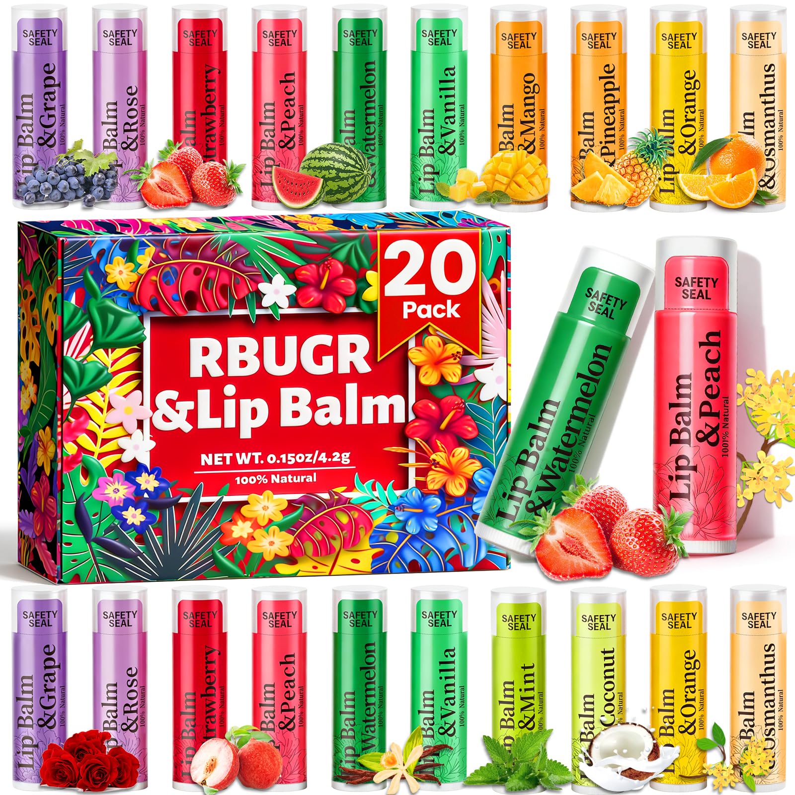 Versatile Use: Each bulk pack includes multiple hydrating lip balm, ideal for party favors, corporate giveaways, event swag, or stocking stuffers. Great for all ages and genders, share them with friends, family, coworkers, or classmates—they'll love this practical, everyday essential!. Compact Portable: Lip care is lightweight and pocket-friendly, toss one in your car, bag, desk, or coat—no bulk, no fuss. Lose one? No big deal—they're affordable and easy to replace. Hydrating Soothing: Lip balm for women is perfect for year-round use, this balm combats dryness caused by seasonal changes, deeply nourishes chapped lips, and keeps them soft and protected. Natural Safe: Lip balms are made from coconut oil, petroleum jelly, paraffin, soybean oil, beeswax, cocoa butter, olive oil, and Vitamin E—all natural, safe ingredients. Free from common allergens like gluten and dairy, these balms are gentle enough even for sensitive lips. 12 Natural Flavors: This organic lip balm comes in 12 flavors: Rose, Grape, Peach, Strawberry, Watermelon, Orange, Mint, Mango, Pineapple, Vanilla, Osmanthus, and Coconut. Each flavor is crafted with natural extracts from fruits and plants to moisturize and repair lips. Every lipbalm contains 4.2g 0.15oz, and each balm is individually sealed for hygiene.