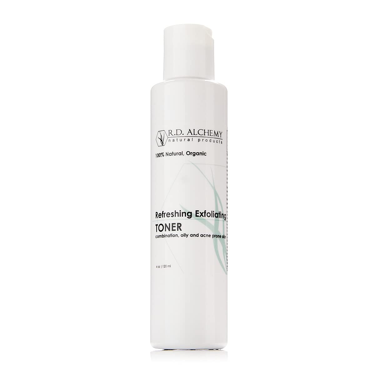 SIZE: 4 oz 120 ml. 100 NATURAL ORGANIC - Our mission here at RD Alchemy is to create non-toxic, therapeutic products based on the sciences of Ethnobotany, Herbal Medicine and Natural Product Chemistry. PERFECT FOR COMBINATION, ACNE PRONE, AND NON-SENSITIVE SKIN TYPES - This unique blend of acids and herbal extracts is specifically designed for those suffering from acne or congested skin by the help of glycolic acid, lactic acid, salicylic acids, witch hazel, and more natural ways of getting rid of acne!. ENHANCES PENETRATION OF YOUR OTHER SERUMS AND MOISTURIZERS - This face toner will remove excess dirt, oil, and make-up as it reduces pH enhancing serum and moisturizer penetration for improved results. LESS ACNE BREAKOUTS - Our best toner for acne, the Refreshing Exfoliating Toner is the best treatment toner for advanced exfoliation and acne as it increases cellular turn-over and reduces inflammation and redness of blemishes for vibrant, healthier skin. CLEARER, MORE VIBRANT SKIN - With renewing, botanical elements, this favorite toner will revive dull, drab skin and reduce the appearance of fine lines and sun spots, creating that clear face that nature intended for you.