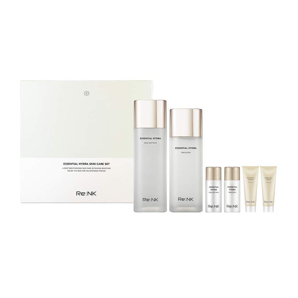 A skincare set that carries one standard size Essential Hydra Skin Softener, one standard size Essential Emulsion, one deluxe sized Essential Hydra Skin Softener, one deluxe size Hydra Serum, and one deluxe sized Hydra Cream. Perfect for those who want to hydrate and moisturize dull, dry skin and consistently maintain a moisturized skin barrier.