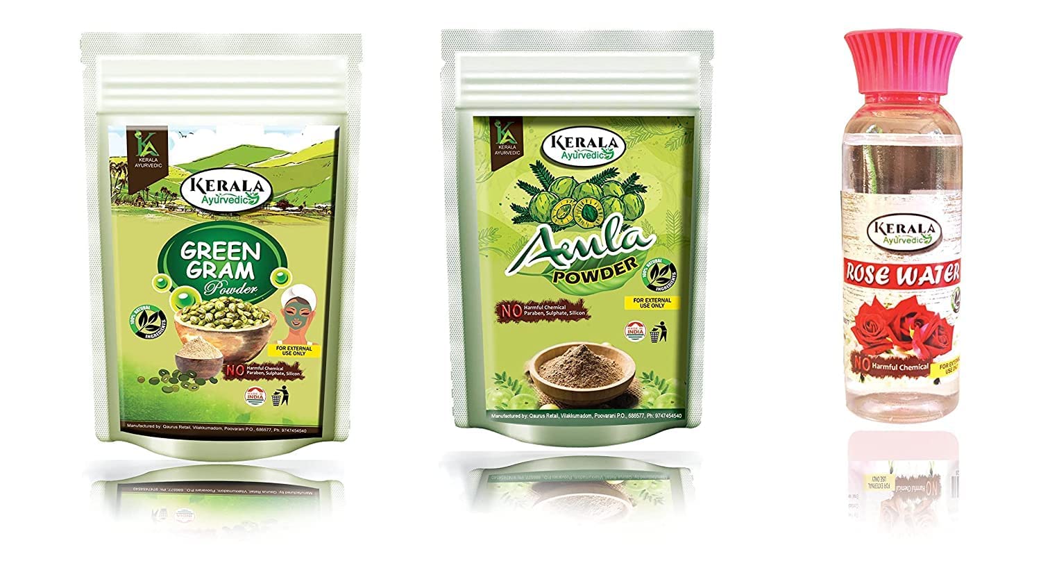 READ qura Ayurvedic green gram powder 100gm green gam powder for skin care 100 g + Amla powder 100 grams Amla powder for face 100 g + rose water 100 ml