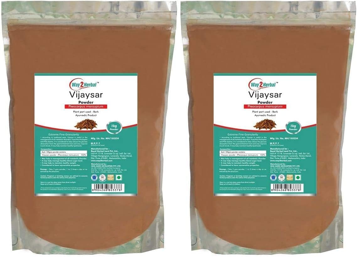 Vijaysar Powder - 1 kg Value Pack of 2. Manufactured by: Isha Agro Developers Pvt Ltd. Our company is India's largest online selling brand of pure herbal powders.Quantity: 2kg (1kg each) Package Contents: Pack of 2 Vijaysar Powder. Target group: Unisex Adults Color: Natural Dosage: Take 3 gms powder, 1 to 2 times a day or as advised by the doctor. Item Form: Powder. Manufactured by: Isha agro developers pvt ltd.QURA Vijaysar Poeder - 1 Kg Value Pack van 2 Vijaysar poeder - 1 kg Value Pack van 2. Gefabriceerd door: Isha Agro Developers Pvt Ltd. Ons bedrijf is India's grootste online verkopende merk in pure kruidenpoeders.Hoeveelheid: 2 kg (elk 1 kg) Inhoud van de verpakking: Pack van 2 Vijaysar-poeder. Doelgroep: Unisex Volwassenen Kleur: Natuurlijk Dosering: Neem 3 gms poeder, 1 tot 2 keer per dag of zoals geadviseerd door de arts. Item Vorm: Poeder. Gefabriceerd door: Isha agro developers pvt ltd.