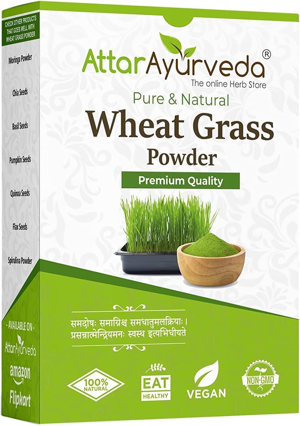 How to use - 1)Mix 1 scoop or 3g of wheatgrass powder in a glass of warm water and drink on an empty stomach. 2) A few drops of honey can be added to improve the taste. 3) Increase the amount of powder as per your body's acceptance. 4) Avoid any other food for half an hour before and after consumption (to absorb it pure).No preservatives added. Pure and natural wheatgrass powder. Cleansing and detoxifying properties. High in nutrients and antioxidants.QURA Tarwegras poeder (100 gram) Hoe te gebruiken - 1)Meng 1 lepel of 3g tarwegras poeder in een glas warm water en drink op een lege maag. 2) Een paar druppels honing kunnen worden toegevoegd om de smaak te verbeteren. 3) Verhoog de hoeveelheid poeder vanaf de acceptatie van uw lichaam. 4) Vermijd elk ander voedsel gedurende een half uur voor en na consumptie (om het puur te absorberen).Geen conserveermiddelen toegevoegd. Zuiver en natuurlijk tarwegras poeder. Reinigende en ontgiftende eigenschappen. Hoog in voedingsstoffen en antioxidanten.