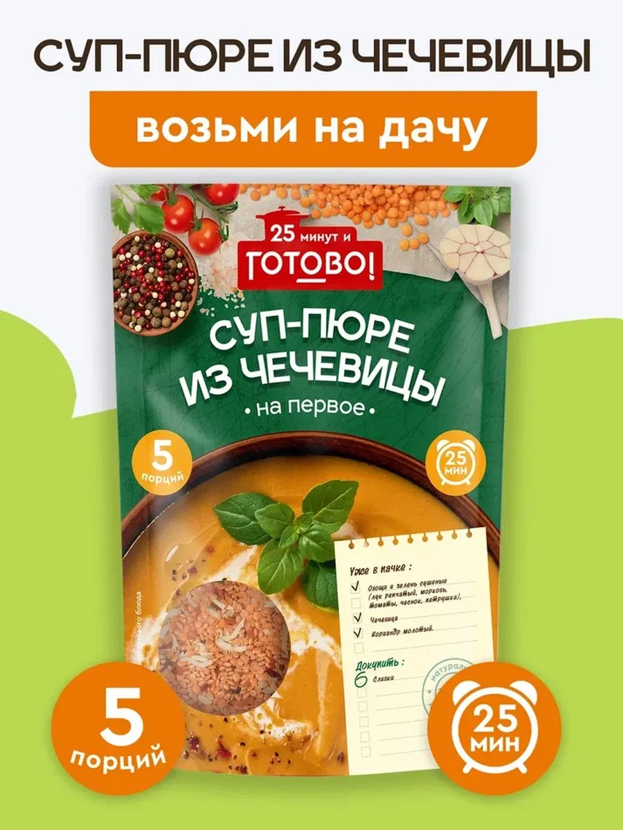 Суп-пюре из чечевицы Готово! готовится легко и быстро. С минимальными временными затратами вы получите вкусное, ароматное и сытное первое блюдо, которым с удовольствием смогут пообедать все члены семьи, ведь одна упаковка рассчитана на пять порций. Достаточно высыпать содержимое пачки в 1,25 л воды или бульона, закрыть крышкой и варить на медленном огне в течение 25 минут, в конце приготовления добавить соль. При желании можно дополнительно придать консистенцию пюре блендером и добавить сливки в качестве нежного соуса. Суп можно готовить в мультиварке, а так же в туристических походах и на даче. Продукция является 100% натуральной, полностью соответствует нормам правильного питания (ПП). Она идеально вписывается в диетическое, веганское, вегетарианское, спортивное меню. Первое блюдо с пряностями, овощной смесью лучших сортов и зеленью не содержит ароматизаторов, консервантов, глумата натрия и ГМО, обладает приятным, изысканным вкусом. Это отличный выбор для тех, кто хочет питаться правильно и вкусно, но при этом не желает тратить много времени и сил на готовку. Порадуйте себя и близких продуктами нашего бренда: у нас есть супы и вторые блюда на любой вкус. Мы заботимся о том, чтобы наши продукты Готово! понравились каждому, поэтому тщательно отобрали ваши любимые вкусы и создали легкие в приготовлении и знакомые всем блюда из отборных круп, натуральных овощей и специй.