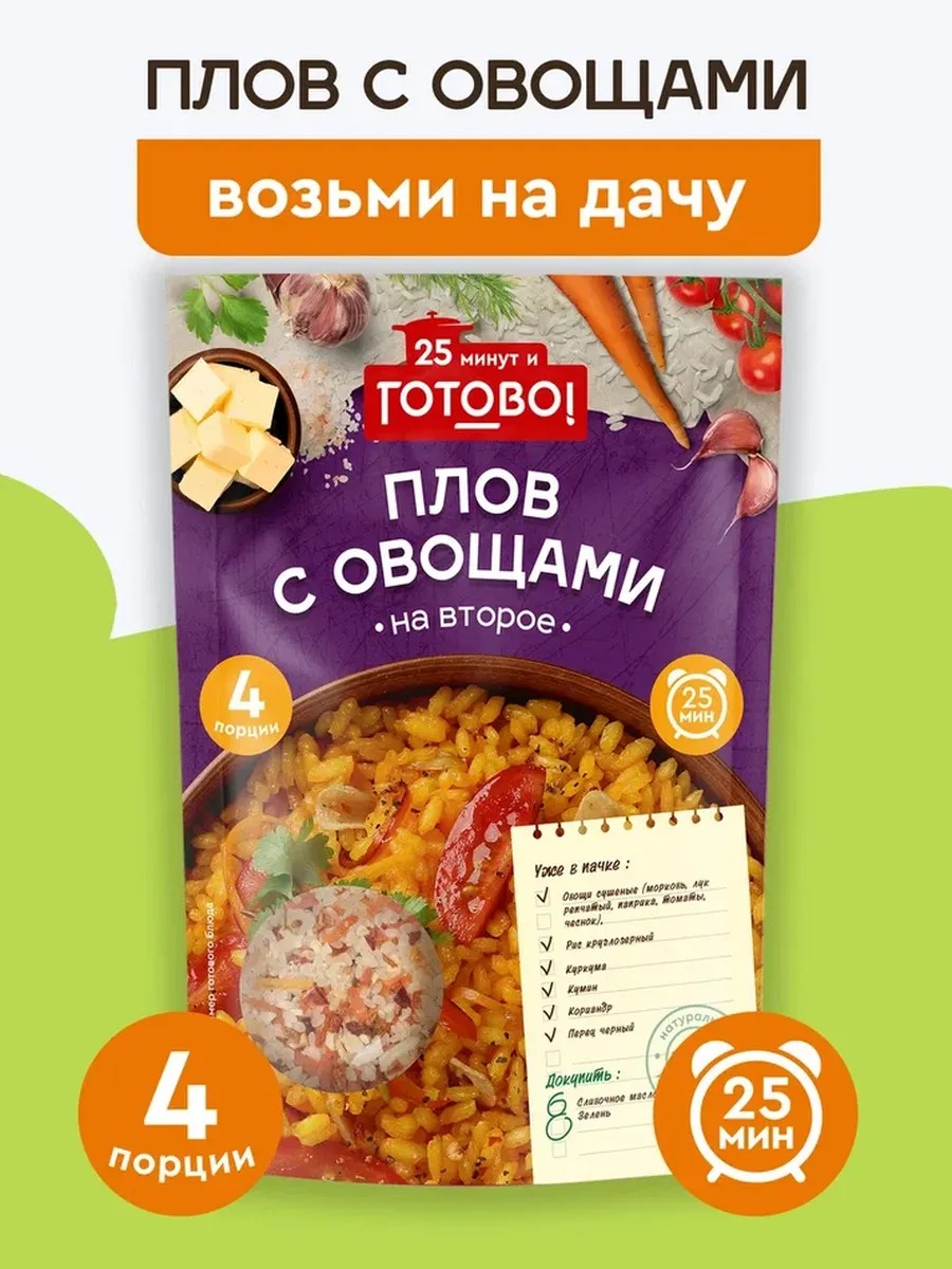 Плов с овощами Готово! - идеальное самостоятельное блюдо на обед или ужин для постного, диетического, вегетарианского (веганского) питания, а также вкусный гарнир с овощами к мясным или рыбным блюдам. Сбалансированный состав на основе натуральных ингредиентов делает блюдо не только аппетитным, но и полезным для организма. Универсальная смесь не содержит ГМО, искусственных ароматизаторов, глутамата натрия. Поэтому подходит для всех, кто ведет здоровый образ жизни и придерживается правильного питания (ПП). В одной упаковке 250 грамм продукта - это 4 порции ароматного второго блюда или гарнира. Плов готовится всего 25 минут. Достаточно высыпать смесь из пачки в сковороду с растопленным сливочным маслом, слегка обжарить так, чтобы овощи не подгорели. Добавить 350 мл воды, посолить, довести до кипения и готовить на медленном огне под крышкой в течение 23 минут, периодически помешивая и доливая еще 750 мл воды. При желании, в смесь с рисом и овощами можно добавить любое мясо, а также приготовить блюдо на воде или бульоне. Овощной плов можно приготовить и в мультиварке дома или на даче, и в котелке в туристическом походе. В составе бакалейного продукта шлифованный круглозерный рис, сушеная морковь, репчатый лук, паприка, красные томаты, чеснок, а также натуральные приправы и специи для плова: куркума, кумин, кориандр и пряный черный перец. Рисовые зерна и овощи - природный источник пищевых волокон. Клетчатка улучшает работу кишечника, пищеварения. Кроме того, ингредиенты блюда содержат витамины и другие полезные вещества, которые укрепляют иммунитет и поддерживают здоровье. Помимо этого, плов низкокалорийный, поэтому подойдет даже тем, кто сидит на диете. Порадуйте себя и близких продуктами нашего бренда: у нас есть супы и вторые блюда на любой вкус. Мы заботимся о том, чтобы наши продукты Готово! понравились каждому, поэтому тщательно отобрали ваши любимые вкусы и создали легкие в приготовлении и знакомые всем блюда из отборных круп, натуральных овощей и специй.