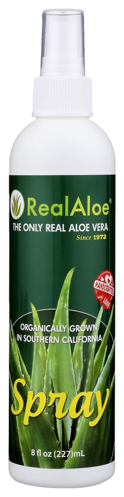 Real Aloe Inc. Aloe Vera Spray Description: Organically Grown. Real Aloe Topical Spray. 100 Vegetarian Ingredients. Moisturizing and Soothing Effects. Relief from Burns and Other Minor Skin Irritations. For the relief of hot, irritating, touch- sensitive, sleep depriving sunburn. This is 99 Aloe Vera Juice in a fine mist spray, It has a cool, soothing effect that helps to relieve the pain of burns, minor cuts, insect bites, scrapes, windburn, chafing and itching. Disclaimer These statements have not been evaluated by the FDA. These products are not intended to diagnose, treat, cure, or prevent any disease.