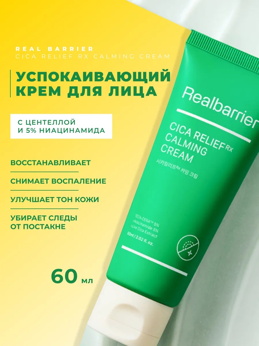 Успокаивающий крем для лица с экстрактом центеллы Real Barrier Cica Relief Rx Calming Cream 60 мл Корея разработан для снижения раздражения и покраснений, обеспечивая коже комфорт и защиту.