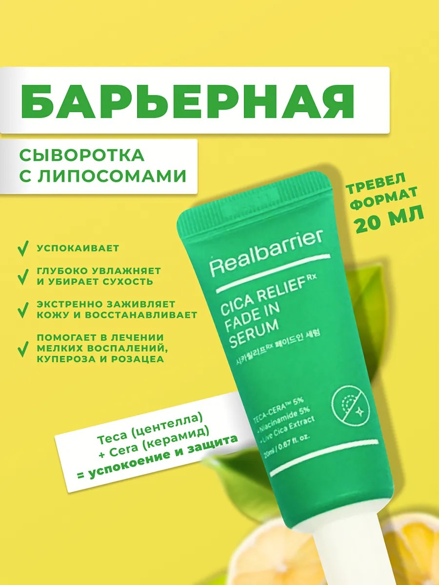 Успокаивающая сыворотка для лица Real Barrier Cica Relief Rx Fade In Serum разработана для уменьшения покраснений и раздражений, обеспечивая коже успокоение и восстановление. Успокаивающая сыворотка для лица с экстрактом центеллы Cicarelief Rx Fade In Serum Real Barrier Коря. Ее основным ингредиентом является экстракт центеллы centella, который успокаивает кожу, борется с воспалениями акне и постакне. Сыворотка Serum 20 мл также содержит ниацинамид 5%, который выравнивает тон кожи, делая ее более сияющей и здоровой. Уникальная технология teca-cera - успокаивает и защищает кожу, стимулирует заживление, способствует укреплению капилляров и борется с признаками купероза. Возможна индивидуальная непереносимость компонентов средства, рекомендуем перед использованием протестировать на небольшом участке кожи руки. С комбинацией центеллы и церамидов обеспечивает мощный уход за кожей, укрепляя ее защитный барьер. Она насыщена витаминами, которые питают и увлажняют кожу, делая ее упругой и здоровой. Доверьте свою кожу лучшим продуктам из Кореи и попробуйте Cicarelief Rx Fade In Serum уже сегодня!