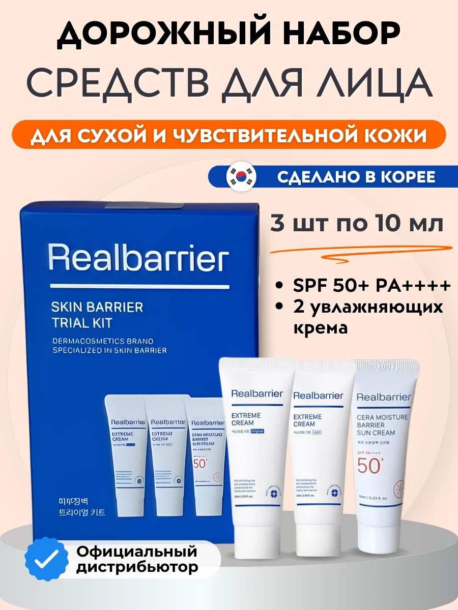 Introducing the Real Barrier Skin Barrier Trial Kit, a facial care set based on lamellar emulsion. Each product in this set is a true treasure in the world of cosmetics. Suitable for the face, décolleté, and neck, the creams in this set are made from natural ingredients. Each product can be used as a day or night cream twice daily. Thanks to its unique formula, it has a lifting effect and stimulates cell renewal. Skin becomes firm, elastic, and fresh. This set of miniature creams moisturizes and softens the skin, leaving it smooth and elastic. This set of sample cosmetics based on lamellar emulsion strengthens the protective barrier, restores the skin, and helps protect against frost and chapping in winter. Treat yourself and your loved ones to high-quality skin care, youth, and beauty for years to come. The set includes: 1) Cera Moisture Barrier Sun Cream SPF 50, 10 ml (1 pc.). 2) Extreme Cream Protective Face Cream for Dry and Sensitive Skin, 10 ml (2 pcs.). If you're looking for the perfect gift for a woman, this is the perfect option. A friend, mom, or colleague will appreciate it.