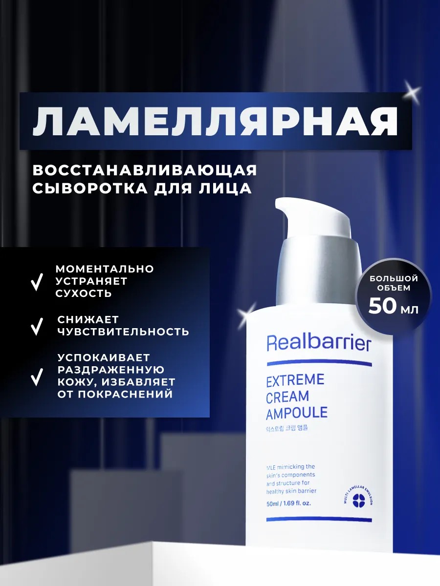 Ламеллярная восстанавливающая ампула сыворотка для лица Real Barrier Extreme Cream Ampoule Корея большой объем 50 мл. Создана для интенсивного восстановления и увлажнения кожи, обеспечивая ей защиту и комфорт. Это идеальное средство для интенсивного ухода за кожей лица. Ее восстанавливающая формула моментально устраняет сухость, успокаивает раздраженную кожу и избавляет от покраснений. Затягивает ранки и царапины, восстанавливает кожу после ожогов и обветриваний. Ампула как заплатка - густая и питательная консистенция питает и обрется с обезвоженностью. Подходит для чувствительной кожи лица. Почувствуйте мгновенное облегчение и увидите результат уже после первого применения! Ухаживайте за своей кожей с заботой Real Barrier Extreme Cream Ampoule!