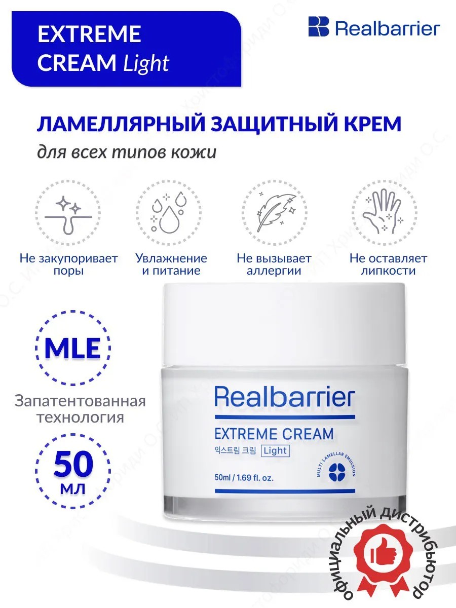 ламеллярный легкий омолаживающий крем для лица Real Barrier Extreme Cream Light 50мл Корея станет незаменимым помощником в уходе за вашей кожей. Специально разработанный для восстановления и увлажнения кожи обеспечит вашей коже максимальный уход. Его уникальсть, что можно использовать после косметалогических процедур. Ламеллярная структура помогает укрепить естественный барьер кожи, защищая ее от негативного воздействия окружающей среды. Крем создан на основе фосфолипидов при помощи особой технологии Multi Lamellar Emulsion. Фосфолипиды, подобно церамидам, восстанавливают липидный барьер кожи и усиливают ее защитные функции, а также становятся источником ненасыщенных жирных кислот. Справляется даже с самой сухой и поврежденной кожей! Real Barrier Extreme Cream Light - это не просто крем, это инновационное средство, которое помогает вернуть вашей коже здоровье и сияние. Благодаря уникальной формуле крем эффективно борется с тусклой и обезвоженной кожей, делая ее упругой и сияющей. Погрузитесь в мир корейской косметики с Real Barrier! Уходовая косметика увлажняет, питает и омолаживает кожу лица, делая ее более здоровой и ухоженной. По версии Power Room Beauty Awards, крем для лица real barrier на 97% повышает степень поглощения негативных факторов окружающей среды, обеспечивает экстра-продолжительность увлажнения на 99% и улучшает состояние тона и микрорельефа в 100% случаев. Крем для лица восстанавливающий особенно эффективен в уходе за сухой и чувствительной кожей. Плюс, корейская косметика – это отличный способ порадовать не только себя, но и близких, сделав им такой приятный подарок.Способ применения: Нанесите необходимое количество крема на сухую очищенную кожу лица. Подходит для комплексного применения утром и вечером.