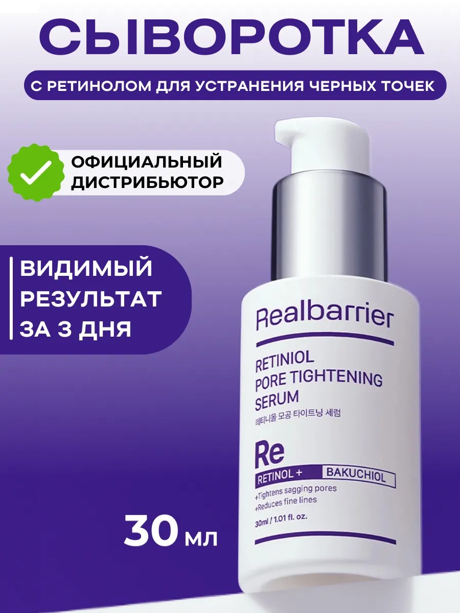 Сыворотка на основе липосомального ретинола и бакучиола Real Barrier Retiniol Pore Tightening Serum обеспечивает комплексный уход за кожей, способствуя её омоложению и восстановлению. Молочная сыворотка помогает уменьшить воспаления, борется с акне и следами постакне, уменьшает жирный блеск. Ретинол также оказывает мощный антивозрастной эффект, уменьшает глубину морщин, выравнивает рельеф кожи. Продукт эффективно выравнивает тон кожи, осветляет пигментацию, оставляя на коже тоже легкое здоровое сияние. Формула содержит 10 видов гиалуроновой кислоты и церамиды, которые глубоко увлажняют, восстанавливают барьер и поддерживают эластичность. Регулярное использование обеспечивает мягкость, гладкость и эластичность. Это омолаживающее средство - отличный подарок женщине на день рождения или другой праздник. Подходит для всех типов кожи, в том числе комбинированной, жирной, а также проблемной. Так как имеет насыщенную текстуру, то подходит также и для сухой кожи. Выбирайте качественную корейскую косметику для естественной красоты вашей кожи.