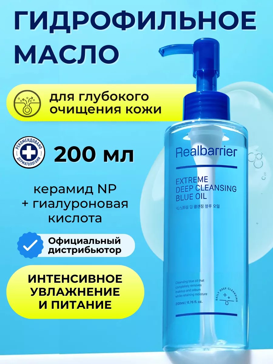 Гидрофильное масло Real Barrier Extreme Deep Cleansing Blue Oil максимально тщательно очищает поры от излишков кожного себума и загрязнений, избавляет от черных точек и комедонов, осветляет сальные нити, укрепляет эпидермальный барьер и защитные функции кожи, снижает чувствительность. Средство устраняет признаки обезвоженности, успокаивает раздражения и красноту, обеспечивает интенсивную и пролонгированную гидратацию и помогает поддерживать оптимальный гидролипидный баланс кожного покрова.