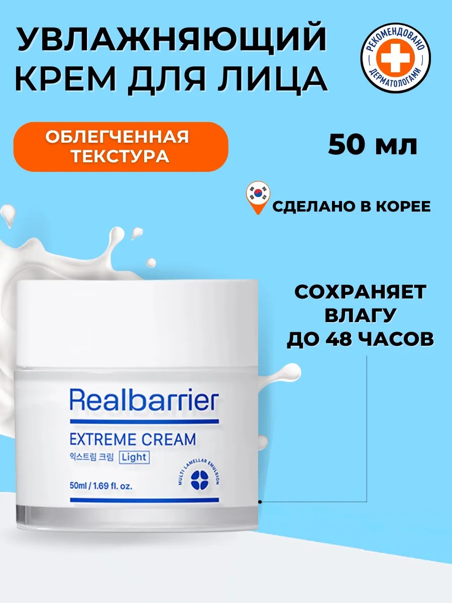 Увлажняющий крем для лица Real Barrier Light Extreme Cream оказывает интенсивное увлажнение и восстановление кожного покрова, мгновенно впитывается, увлажняет за 3 секунды и сохраняет влагу в клетках кожи в течение 48 часов. Средство восстанавливает водный баланс и оказывает успокаивающее действие. Ламеллярный крем с MLE-эмульсией работает в нескольких направлениях. Он отлично подойдёт для интенсивного увлажнения лица, т.к. сохраняет влагу в коже до 48 часов. Мгновенно впитывается, не оставляя липкости и жирности на лице. Идеально подходит для сухой, чувствительной и обезвоженной кожи любого типа, в том числе проблемной. В основе средства – запатентованная на международном уровне формула MLE SKIN BARRIER FORMULA, или мульти-ламеллярная эмульсия с комплексом керамидов и гиалуроновой кислотой, которую защитный барьер воспринимает как «родную». Керамиды 9STM + 5SPTM повышают иммунитет кожи к вредным факторам окружающей среды, улучшают проникновение других активных компонентов, сохраняют ценную влагу в коже.