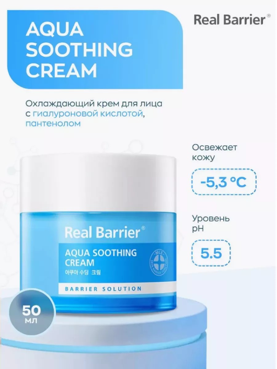 Корейский успокаивающий крем для лица Real Barrier Aqua Soothing Cream с 7 видами разномолекулярной гиалуроновой кислоты дарит коже абсолютное увлажнение, спокойствие и комфорт. Ламеллярный крем-гель охлаждает кожу на 5.3 ° сразу после нанесения, снимает раздражение и красноту, устраняет сухость и шелушение. Лёгкая текстура мгновенно впитывается независимо от типа кожи. Идеально подходит для сухой, чувствительной и обезвоженной кожи любого типа. В основе средства – запатентованная на международном уровне формула MLE SKIN BARRIER FORMULA, или мульти-ламеллярная эмульсия с комплексом керамидов и гиалуроновой кислотой, которую защитный барьер воспринимает как «родную». Керамиды 9STM + 5SPTM повышают иммунитет кожи к вредным факторам окружающей среды, улучшают проникновение других активных компонентов, сохраняют ценную влагу в коже.