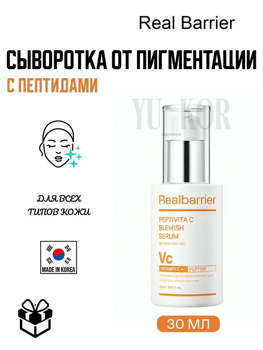 Сыворотка от пигментации с пептидами Real Barrier Peptivita C Blemish Serum уменьшает выраженность пигментных пятен и постакне, избавляет от тусклости, выравнивает тон и придаёт здоровое сияние. Разглаживает текстуру, смягчает огрубевшие участки, осветляет чёрные точки и сальные нити. Поддерживает упругость и эластичность, сокращает глубину морщин. Содержит стабильный липосомальный витамин C, 12 пептидов, ниацинамид, глутатион, феруловую кислоту, церамиды, астаксантин и аминокислоты. Уровень pH ±5.0-6.0.