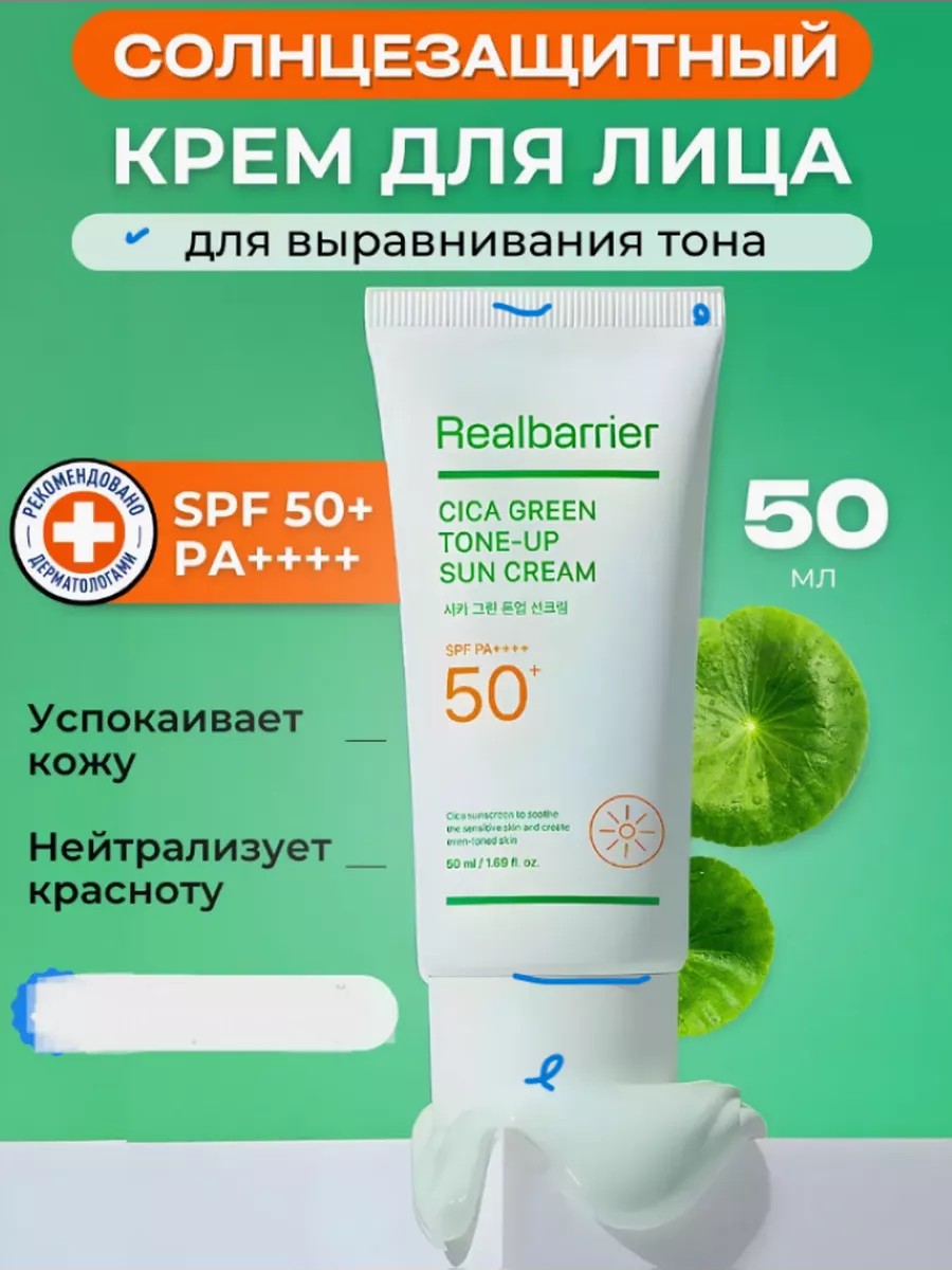 Real Barrier SPF50 Cica Green Tone-Up Sun Cream provides reliable UV protection, instantly soothes, reduces redness and irritation, evens out skin tone, and promotes accelerated lightening of age spots and reduces hypersensitivity. This product provides intense hydration and prevents moisture loss, maintaining optimal cellular moisture levels for a long time, softening rough skin and refreshing it. The formula includes the patented TECA-CERA complex, which consists of centella asiatica and ceramide 9S. It instantly soothes erythema and other irritations, promotes the restoration and strengthening of the epidermal veil, activates the healing process, and reduces the appearance of rosacea and couperose. The complex molecules are encapsulated in liposomes, which are smaller than pores, allowing the active ingredients to penetrate deep into the skin for the fastest and most visible results. The cream's light texture absorbs quickly, leaving no stickiness or greasy film, neutralizing redness and delicately evens out skin tone.