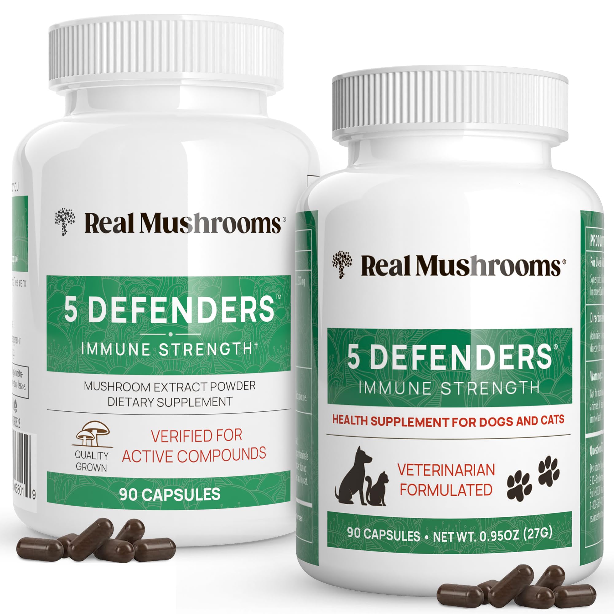 Real Mushrooms 5 Defenders for Humans (90ct) & Pets (90ct) - Capsules Bundle - Chaga Shiitake Maitake Turkey Tail & Reishi Mushroom - for Immune Strength & Overall Wellbeing - Vegan Non-GMO