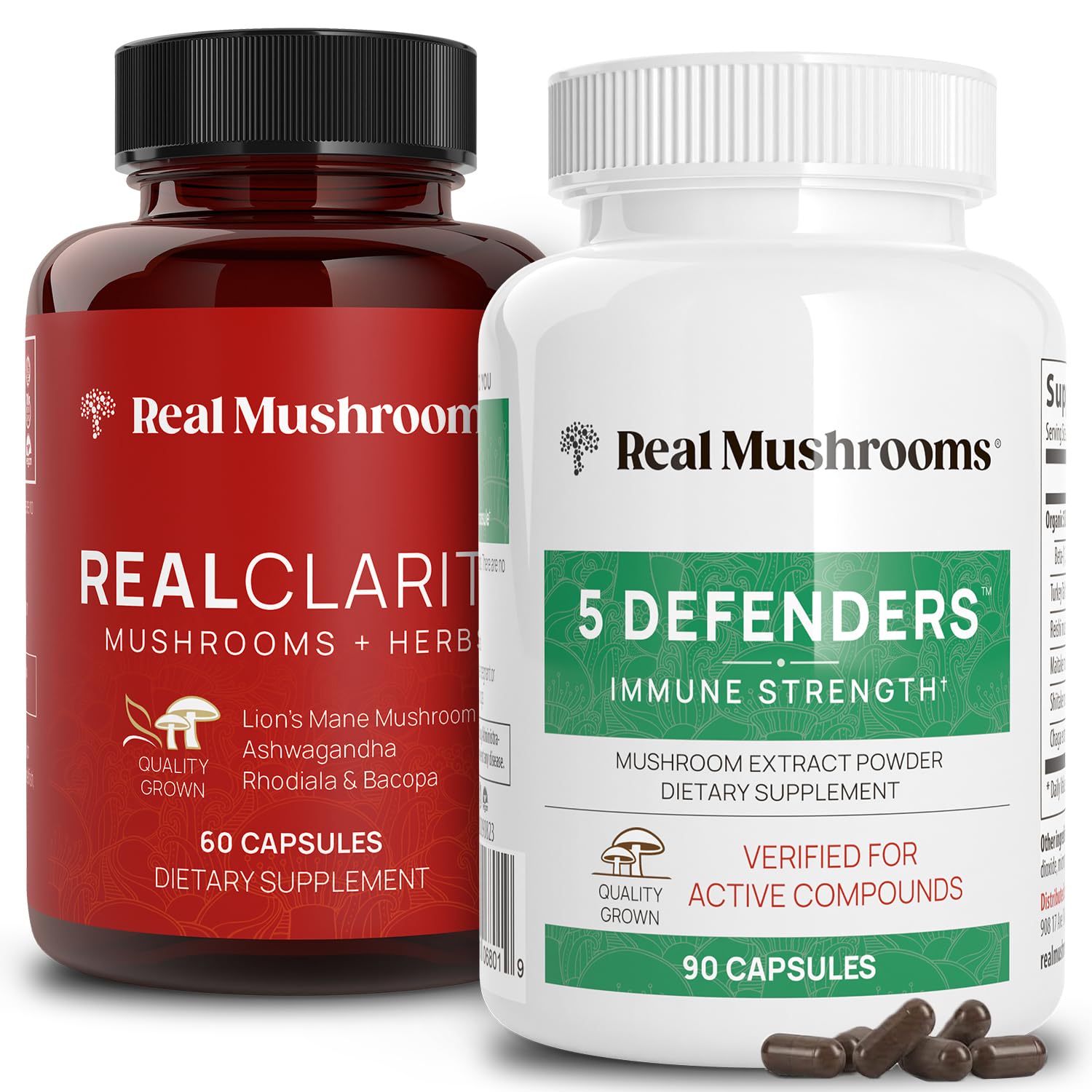 Real Mushrooms RealClarity (60ct) and 5 Defenders (90ct) Capsules Bundle - Mushroom Supplement for Mental Clarity Focus & Immune Strength - Vegan Non-GMO Verified Levels of Beta-Glucans