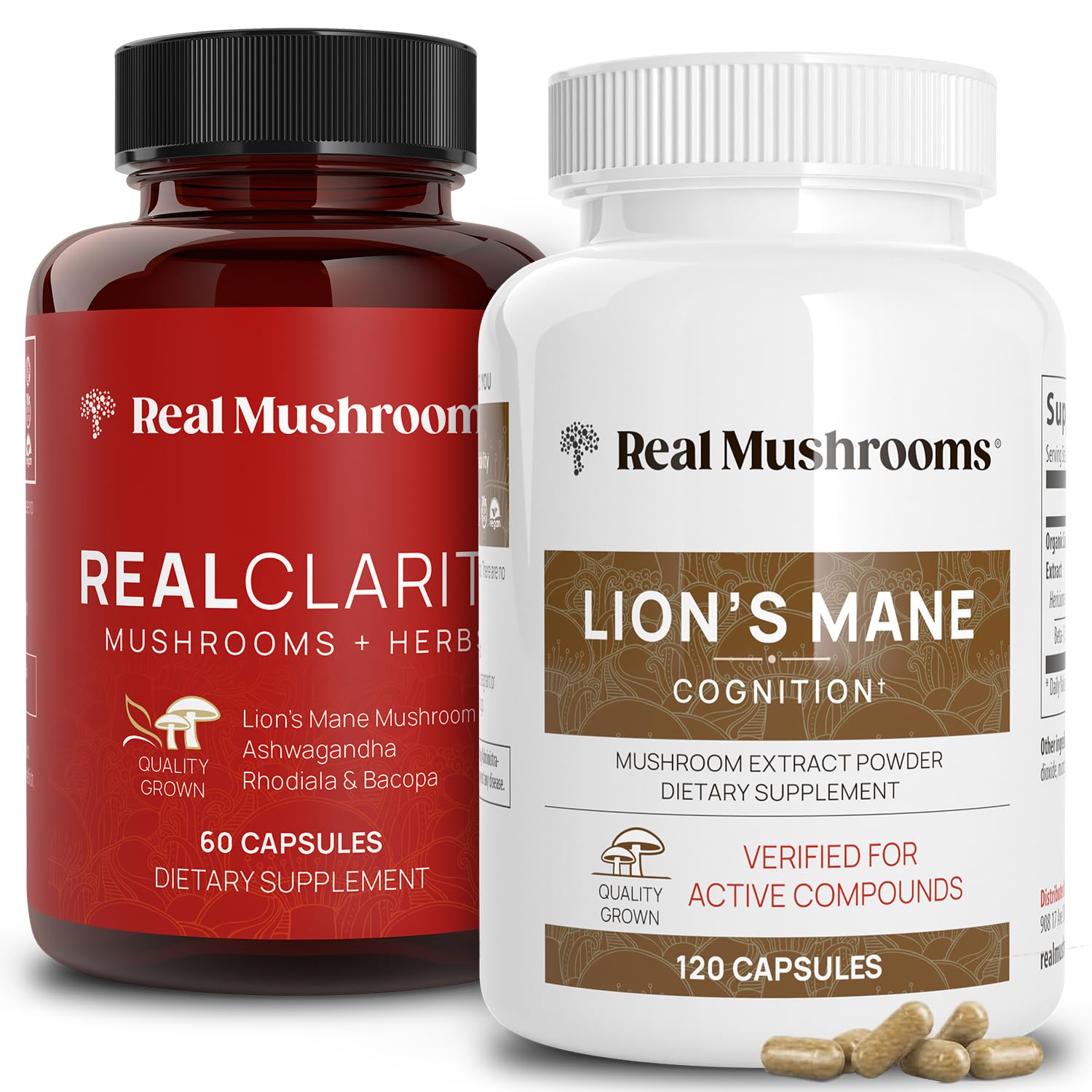 Real Mushrooms RealClarity (60ct) and Lions Mane (120ct) Capsules Bundle - Mushroom Supplement for Brain Health Mental Clarity Focus Cognition & Immune Support - Brain Vitamins w/Ashwagandha